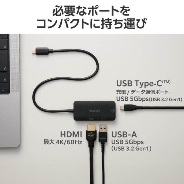 ノートパソコンへ給電しながらHDMI(R)映像出力ができる、3ポート搭載のUSB Type-C(TM)接続ドッキングステーションです。必要最小限の機能でコンパクトなサイズながら、取り回ししやすいゆったり30cmケーブルで、抜群の使いやすさを実現。高解像度での映像出力も可能です。![]() ■USB Type-C(TM)プラグでパソコンに接続し、パソコンを充電しながらUSB 5Gbps(USB3.2(Gen1))機器やHDMI(R)ケーブルを接続できるドッキングステーションです。 ■USB Type-C対応AC充電器を接続してパソコン本体の充電が可能。最大100Wをデバイス・本体に供給するUSB Power Deliveryに対応しています。 ■※製品本体にて8Wを消費しますので、実際の出力は最大92Wとなります。 ■※92Wで給電が必要な場合は、100W出力のAC充電器をご用意ください。 ■USB-Aポート、USB Type-CポートはいずれもUSB 5Gbps。高速データ転送が可能で、大きなファイルもスムーズに転送できます。 ■HDMIポートは最大4K60Hzの高解像度に対応。大きなディスプレイに接続した際もなめらかで高画質の表示が可能で、作業を効率化できます。 ■ケーブルは紛失の心配がない直付けタイプです。タブレットPC/2in1パソコンでもゆったり接続できるケーブル長約30cmです。 ■※法人で導入を検討される場合は、ご購入前にお客様の環境での検証をおすすめいたします。 ■※接続するUSB Type-Cポート搭載機器の仕様の違いより、一部機能をご利用いただけない場合があります。 ■※パソコン充電用のUSB Type-C対応AC充電器は付属していません。別途ご用意ください。 ■※USB Type-Cポートからの充電に対応しないパソコンの場合、本製品のUSB Type-Cポート経由での本体充電はできません。充電を行う際は、パソコンがUSB Power Deliveryに対応していることを確認してください。 ■※USB Type-Cポートからの映像出力に対応しないパソコンの場合、本製品の映像出力ポートは動作しません。映像出力を行う際は機器がDisplayPort(TM) Alt Modeに対応していることを確認してください。 ■※本製品はOS起動前のシステム画面やBIOS画面では動作しません。 ■※本製品はパソコン本体のUSB Type-Cポートに直接接続してください。USBハブや増設ボードのUSB Type-Cポートに接続した場合、本製品をご利用いただけません。 ■※USB Type-C and USB-C are trademarks of USB Implementers Forum. ■自社環境認定基準を1つ以上満たし、『THINK ECOLOGY』マークを表示した製品です。 ■環境保全に取り組み、製品の包装容器におけるプラスチック重量を、社内基準製品より20%以上削減した製品です。 ■環境保全に取り組み、製品の包装容器が紙・ダンボール・ポリ袋のみで構成されている製品です。 ![]() ■対応OS(Windows):Windows 11/10 ■対応OS(macOS):macOS Sonoma 14/macOS Ventura 13/macOS Monterey 12 ■対応OS(iPadOS):iPadOS 17/16 ■対応OS 備考:※各OSの最新バージョンへのアップデートや、サービスパックのインストールが必要になる場合があります。 ■コネクター形状:USB Type-C(TM)プラグ<USB 5Gbps(USB3.2(Gen1))>、USB Power Delivery対応(最大入力100W / 最大出力92W)、DisplayPort(TM) Alt mode (USB2.0接続時はUSB2.0互換で動作(USB2.0時は映像出力非対応)) ■USBポート(ダウンストリーム):1:USB Type-Cポート<USB 5Gbps(USB3.2(Gen1))>×1 ※充電/データ通信用 ■USBポート(ダウンストリーム):※USB Power Delivery対応AC充電器と接続した際、USB Type-Cポートは充電用になります。 ■USBポート(ダウンストリーム):充電時供給電力 : 充電用USB Power Deliveryポート100W ※製品本体にて8Wを消費しますので、実際の出力は最大92Wとなります。 ■USBポート(ダウンストリーム):データ通信時:周辺機器デバイスと接続時、データ通信用になります。供給電力:7.5W(5V/1.5A)、転送速度:最大<USB 5Gbps(USB3.2(Gen1))> ■USBポート(ダウンストリーム):2:USB-Aポート<USB 5Gbps(USB3.2(Gen1))>×1、供給電力:7.5W(5V/1.5A) ■映像出力ポート(ダウンストリーム):HDMI(R)ポート×1<対応解像度:最大4K/60Hz> ■電源方式:バスパワー ■ケーブル長:約30cm ※コネクター含まず ■カラー:ブラック ■外形寸法:製品本体:幅約72mm×奥行約34mm×高さ約11.5mm ※ケーブル含まず ■動作環境:温度5℃〜40℃、湿度30%〜80% ※結露なきこと ■保証期間:1年間 |