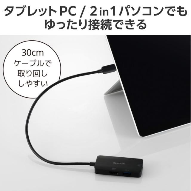 ノートパソコンへ給電しながらHDMI(R)映像出力ができる、3ポート搭載のUSB Type-C(TM)接続ドッキングステーションです。必要最小限の機能でコンパクトなサイズながら、取り回ししやすいゆったり30cmケーブルで、抜群の使いやすさを実現。高解像度での映像出力も可能です。
