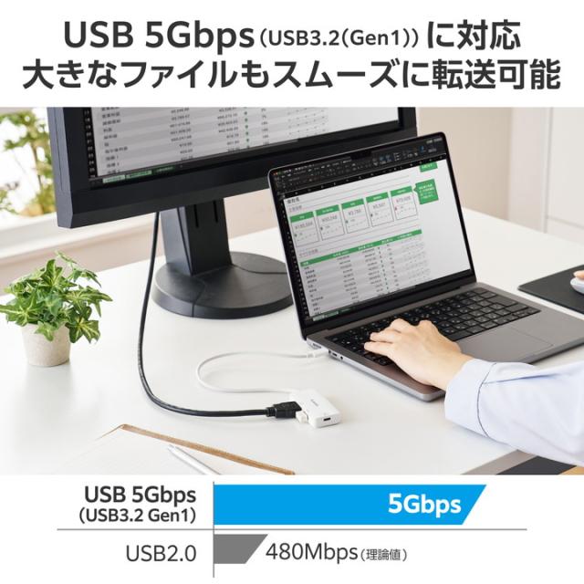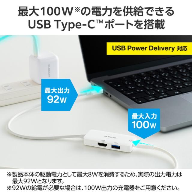 ノートパソコンへ給電しながらHDMI(R)映像出力ができる、3ポート搭載のUSB Type-C(TM)接続ドッキングステーションです。必要最小限の機能でコンパクトなサイズながら、取り回ししやすいゆったり30cmケーブルで、抜群の使いやすさを実現。高解像度での映像出力も可能です。![]() ■USB Type-C(TM)プラグでパソコンに接続し、パソコンを充電しながらUSB 5Gbps(USB3.2(Gen1))機器やHDMI(R)ケーブルを接続できるドッキングステーションです。 ■USB Type-C対応AC充電器を接続してパソコン本体の充電が可能。最大100Wをデバイス・本体に供給するUSB Power Deliveryに対応しています。 ■※製品本体にて8Wを消費しますので、実際の出力は最大92Wとなります。 ■※92Wで給電が必要な場合は、100W出力のAC充電器をご用意ください。 ■USB-Aポート、USB Type-CポートはいずれもUSB 5Gbps。高速データ転送が可能で、大きなファイルもスムーズに転送できます。 ■HDMIポートは最大4K60Hzの高解像度に対応。大きなディスプレイに接続した際もなめらかで高画質の表示が可能で、作業を効率化できます。 ■ケーブルは紛失の心配がない直付けタイプです。タブレットPC/2in1パソコンでもゆったり接続できるケーブル長約30cmです。 ■※法人で導入を検討される場合は、ご購入前にお客様の環境での検証をおすすめいたします。 ■※接続するUSB Type-Cポート搭載機器の仕様の違いより、一部機能をご利用いただけない場合があります。 ■※パソコン充電用のUSB Type-C対応AC充電器は付属していません。別途ご用意ください。 ■※USB Type-Cポートからの充電に対応しないパソコンの場合、本製品のUSB Type-Cポート経由での本体充電はできません。充電を行う際は、パソコンがUSB Power Deliveryに対応していることを確認してください。 ■※USB Type-Cポートからの映像出力に対応しないパソコンの場合、本製品の映像出力ポートは動作しません。映像出力を行う際は機器がDisplayPort(TM) Alt Modeに対応していることを確認してください。 ■※本製品はOS起動前のシステム画面やBIOS画面では動作しません。 ■※本製品はパソコン本体のUSB Type-Cポートに直接接続してください。USBハブや増設ボードのUSB Type-Cポートに接続した場合、本製品をご利用いただけません。 ■※USB Type-C and USB-C are trademarks of USB Implementers Forum. ■自社環境認定基準を1つ以上満たし、『THINK ECOLOGY』マークを表示した製品です。 ■環境保全に取り組み、製品の包装容器におけるプラスチック重量を、社内基準製品より20%以上削減した製品です。 ■環境保全に取り組み、製品の包装容器が紙・ダンボール・ポリ袋のみで構成されている製品です。 ![]() ■対応OS(Windows):Windows 11/10 ■対応OS(macOS):macOS Sonoma 14/macOS Ventura 13/macOS Monterey 12 ■対応OS(iPadOS):iPadOS 17/16 ■対応OS 備考:※各OSの最新バージョンへのアップデートや、サービスパックのインストールが必要になる場合があります。 ■コネクター形状:USB Type-C(TM)ブラグ<USB 5Gbps(USB3.2(Gen1))>、USB Power Delivery対応(最大入力100W / 最大出力92W)、DisplayPort(TM) Alt mode (USB2.0接続時はUSB2.0互換で動作(USB2.0時は映像出力非対応)) ■USBポート(ダウンストリーム):1:USB Type-Cポート<USB 5Gbps(USB3.2(Gen1))>×1 ※充電/データ通信用 ■USBポート(ダウンストリーム):※USB Power Delivery対応AC充電器と接続した際、USB Type-Cポートは充電用になります。 ■USBポート(ダウンストリーム):充電時供給電力 : 充電用USB Power Deliveryポート100W ※製品本体にて8Wを消費しますので、実際の出力は最大92Wとなります。 ■USBポート(ダウンストリーム):データ通信時:周辺機器デバイスと接続時、データ通信用になります。供給電力:7.5W(5V/1.5A)、転送速度:最大<USB 5Gbps(USB3.2(Gen1))> ■USBポート(ダウンストリーム):2:USB-Aポート<USB 5Gbps(USB3.2(Gen1))>×1、供給電力:7.5W(5V/1.5A) ■映像出力ポート(ダウンストリーム):HDMI(R)ポート×1<対応解像度:最大4K/60Hz> ■電源方式:バスパワー ■ケーブル長:約30cm ※コネクター含まず ■カラー:ホワイト ■外形寸法:製品本体:幅約72mm×奥行約34mm×高さ約11.5mm ※ケーブル含まず ■動作環境:温度5℃〜40℃、湿度30%〜80% ※結露なきこと ■保証期間:1年間 |