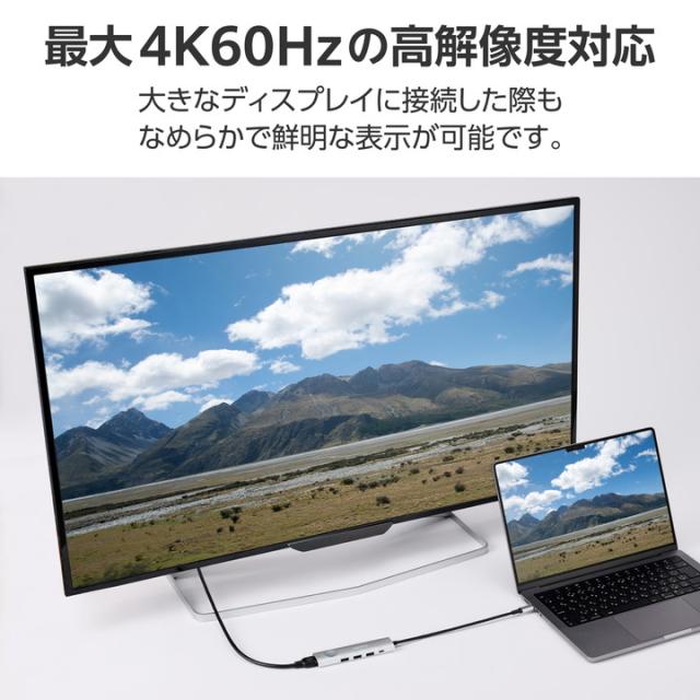 HDMI(R)・USB-A・USB Type-C(TM)ポートを搭載し、さまざまな機能を拡張できる6in1タイプのドッキングステーションです。通常の出力ポートに加え、外部ディスプレイのON/OFFを瞬時に切り替えられるスイッチ付き。ビジネスシーンで見られたくない画面を一時的に隠せる、便利な機能を搭載しています。![]() ■USB Type-C(TM)ポートから最大6つのポートに多様な機器を接続できるドッキングステーションです。 ■外部ディスプレイのON/OFFを瞬時に切り替えられるスイッチを搭載。HDMI(R)で出力した画面を、ケーブルを抜き挿しせずワンタッチで点けたり消したりできます。 ■会議やプレゼンの際、内部資料やパスワードの入力ウィンドウなど見られたくない画面を一時的に画面OFFで隠せます。展示会やお客様対応時に映像エラーが発生した際なども、慌てることなくスムーズにディスプレイの表示を切って対応できます。 ■幅約3cmのスリムタイプ。かばんやガジェットポーチなどにすっきり収納でき、外出時の利用に便利です。 ■HDMIポートは最大4K60Hzの高解像度に対応。大きなディスプレイに接続した際もなめらかで鮮明な表示が可能です。 ■USB Type-Cポートを2つ搭載。充電専用USB Type-Cポートは、USB Power Delivery 100Wでの使用が可能。AC充電器を接続してパソコン本体を充電できます。 ■※製品本体にて15Wを消費しますので、実際の出力は最大85Wとなります。 ■※85Wで給電が必要な場合は、100W出力のAC充電器をご用意ください。 ■USB-Aポートを3つ搭載。マウスやキーボード、USBメモリなどの周辺機器を一括接続できます。 ■USB-Aポート、USB Type-CポートはいずれもUSB 5Gbps。高速データ転送が可能で、大きなファイルもスムーズに転送できます。 ■ケーブルは紛失の心配がない直付けタイプ。ケーブル長は約20cmと取り回しのしやすい長さです。 ■※法人で導入を検討されるお客さまは、ご購入前にお客様の環境での検証をおすすめいたします。 ■※接続するUSB Type-Cポート搭載機器の仕様の違いより、一部機能をご利用いただけない場合があります。 ■※パソコン充電用のUSB Type-C対応AC充電器は付属しておりません。別途ご用意ください。 ■※USB Type-Cポートからの充電に対応しないパソコンの場合、本製品のUSB Type-Cポート経由での本体充電はできません。充電を行う際は、パソコンがUSB Power Deliveryに対応していることを確認してください。 ■※USB Type-Cポートからの映像出力に対応しないパソコンの場合、本製品の映像出力ポートは動作しません。映像出力を行う際は機器がDisplayPort Alt Modeに対応していることを確認してください。 ■※本製品はOS起動前のシステム画面やBIOS画面では動作しません。 ■※本製品はパソコン本体のUSB Type-Cポートに直接接続してください。USBハブや増設ボードのUSB Type-Cポートに接続した場合、本製品をご利用いただけません。 ■※USB Type-C and USB-C are trademarks of USB Implementers Forum. ■自社環境認定基準を1つ以上満たし、『THINK ECOLOGY』マークを表示した製品です。 ■廃棄物削減に取り組み、製品に同梱する取扱説明書等をペーパーレス化した製品です。 ■環境保全に取り組み、製品の包装容器におけるプラスチック重量を、社内基準製品より20%以上削減した製品です。 ■環境保全に取り組み、製品の包装容器が紙・ダンボール・ポリ袋のみで構成されている製品です。 ![]() ■対応OS(Windows):Windows 11/10 ■対応OS(macOS):macOS Sonoma 14/macOS Ventura 13 ■対応OS(iPadOS):iPadOS 17/16 ■対応OS 備考:※各OSの最新バージョンへのアップデートや、サービスパックのインストールが必要になる場合があります。 ■コネクター仕様(アップストリーム):USB Type-C(TM))プラグ×1<USB 5Gbps(USB3.1(Gen1))/USB2.0/USB1.1> ※USB Power Delivery対応(最大入力100W/最大出力85W)、DisplayPort(TM) Alt mode(USB2.0接続時はUSB2.0互換で動作(USB2.0時は映像出力非対応)) ■USBポート(ダウンストリーム):1:USB Type-Cポート×1 ※充電専用USB Power Deliveryポート ■USBポート(ダウンストリーム):2:USB Type-Cポート<USB 5Gbps(USB3.2(Gen1))>×1 ※データ通信専用。映像出力には対応していません。 ■USBポート(ダウンストリーム):3:USB-Aポート<USB 5Gbps(USB3.2Gen1))>×3 ■USBポート(ダウンストリーム):※最大供給電力:4ポート合計15W(5V/3A) ■USBポート(ダウンストリーム):※本製品はUSBポートを増設するための製品です。本製品を使用してスマートフォン・タブレットを充電することはおすすめできません。 ■映像出力ポート(ダウンストリーム):HDMI(R)ポート×1<対応解像度:最大4K/60Hz> ■映像出力ポート(ダウンストリーム):※記載の対応解像度はご使用のパソコンがDisplayPort Alt Mode(DP1.4以上)に対応している必要があります。 ■電源方式:バスパワー ■ケーブル長:約20cm ※コネクター含まず ■カラー:シルバー ■外形寸法:幅約29mm×奥行約123mm×高さ約13mm ※ケーブル含まず ■動作環境:温度5〜40℃、湿度30〜80% ※結露なきこと ■保証期間:1年間 |