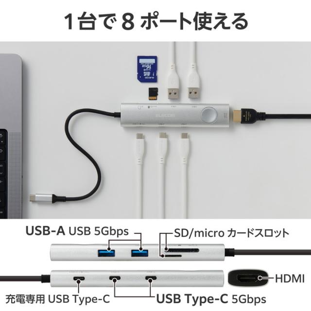 エレコム Type-C ドッキングステーション SDカードスロット付き PD対応 USB-A×2 USB-C×3 HDMI スイッチ付 シルバー┃DST-S080BPSV