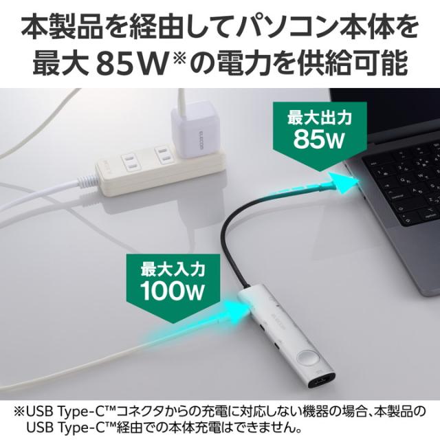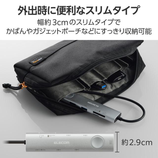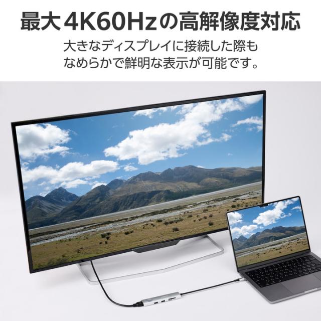 HDMI(R)・USB-A・USB Type-C(TM)ポートなどを搭載し、さまざまな機能を拡張できる8in1タイプのドッキングステーションです。通常の出力ポートに加え、外部ディスプレイのON/OFFを瞬時に切り替えられるスイッチ付き。ビジネスシーンで見られたくない画面を一時的に隠せる、便利な機能を搭載しています。![]() ■USB Type-C(TM)ポートから最大8つのポートに多様な機器を接続できるドッキングステーションです。 ■外部ディスプレイのON/OFFを瞬時に切り替えられるスイッチを搭載。HDMI(R)で出力した画面を、ケーブルを抜き挿しせずワンタッチで点けたり消したりできます。 ■会議やプレゼンの際、内部資料やパスワードの入力ウィンドウなど見られたくない画面を一時的に画面OFFで隠せます。展示会やお客様対応時に映像エラーが発生した際なども、慌てることなくスムーズにディスプレイの表示を切って対応できます。 ■幅約3cmのスリムタイプ。かばんやガジェットポーチなどにすっきり収納でき、外出時の利用に便利です。 ■HDMIポートは最大4K60Hzの高解像度に対応。大きなディスプレイに接続した際もなめらかで鮮明な表示が可能です。 ■USB Type-Cポートを3つ搭載。充電専用USB Type-Cポートは、USB Power Delivery 100Wでの使用が可能。AC充電器を接続してパソコン本体を充電できます。 ■※製品本体にて15Wを消費しますので、実際の出力は最大85Wとなります。 ■※85Wで給電が必要な場合は、100W出力のAC充電器をご用意ください。 ■USB-Aポートを2つ搭載。マウスやキーボード、USBメモリなどの周辺機器を一括接続できます。 ■USB-Aポート、USB Type-CポートはいずれもUSB 5Gbps。高速データ転送が可能で、大きなファイルもスムーズに転送できます。 ■SDカードスロット・microSDカードスロットをそれぞれ搭載。写真や動画のデータをパソコンで手軽に確認できます。 ■※一度に読み込みができるのはSDカード・microSDカードのいずれか1枚のみです。同時に挿して読み込むことはできません。 ■ケーブルは紛失の心配がない直付けタイプ。ケーブル長は約20cmと取り回しのしやすい長さです。 ■※法人で導入を検討されるお客さまは、ご購入前にお客様の環境での検証をおすすめいたします。 ■※接続するUSB Type-Cポート搭載機器の仕様の違いより、一部機能をご利用いただけない場合があります。 ■※パソコン充電用のUSB Type-C対応AC充電器は付属しておりません。別途ご用意ください。 ■※USB Type-Cポートからの充電に対応しないパソコンの場合、本製品のUSB Type-Cポート経由での本体充電はできません。充電を行う際は、パソコンがUSB Power Deliveryに対応していることを確認してください。 ■※USB Type-Cポートからの映像出力に対応しないパソコンの場合、本製品の映像出力ポートは動作しません。映像出力を行う際は機器がDisplayPort Alt Modeに対応していることを確認してください。 ■※本製品はOS起動前のシステム画面やBIOS画面では動作しません。 ■※本製品はパソコン本体のUSB Type-Cポートに直接接続してください。USBハブや増設ボードのUSB Type-Cポートに接続した場合、本製品をご利用いただけません。 ■※USB Type-C and USB-C are trademarks of USB Implementers Forum. ■自社環境認定基準を1つ以上満たし、『THINK ECOLOGY』マークを表示した製品です。 ■廃棄物削減に取り組み、製品に同梱する取扱説明書等をペーパーレス化した製品です。 ■環境保全に取り組み、製品の包装容器におけるプラスチック重量を、社内基準製品より20%以上削減した製品です。 ■環境保全に取り組み、製品の包装容器が紙・ダンボール・ポリ袋のみで構成されている製品です。 ![]() ■対応OS(Windows):Windows 11/10 ■対応OS(macOS):macOS Sonoma 14/macOS Ventura 13 ■対応OS(iPadOS):iPadOS 17/16 ■対応OS 備考:※各OSの最新バージョンへのアップデートや、サービスパックのインストールが必要になる場合があります。 ■コネクター仕様(アップストリーム):USB Type-C(TM))プラグ×1<USB 5Gbps(USB3.1(Gen1))/USB2.0/USB1.1> ※USB Power Delivery対応(最大入力100W/最大出力85W)、DisplayPort(TM) Alt mode(USB2.0接続時はUSB2.0互換で動作(USB2.0時は映像出力非対応)) ■USBポート(ダウンストリーム):1:USB Type-Cポート×1 ※充電専用USB Power Deliveryポート ■USBポート(ダウンストリーム):2:USB Type-Cポート<USB 5Gbps(USB3.2(Gen1))>×2 ※データ通信専用。映像出力には対応していません。 ■USBポート(ダウンストリーム):3:USB-Aポート<USB 5Gbps(USB3.2Gen1))>×2 ■USBポート(ダウンストリーム):※最大供給電力:4ポート合計15W(5V/3A) ■USBポート(ダウンストリーム):※本製品はUSBポートを増設するための製品です。本製品を使用してスマートフォン・タブレットを充電することはおすすめできません。 ■映像出力ポート(ダウンストリーム):HDMI(R)ポート×1<対応解像度:最大4K/60Hz> ■映像出力ポート(ダウンストリーム):※記載の対応解像度はご使用のパソコンがDisplayPort Alt Mode(DP1.4以上)に対応している必要があります。 ■カードリーダー(ダウンストリーム):SDカードスロット×1 ※SD/SDHC/SDXC、mic