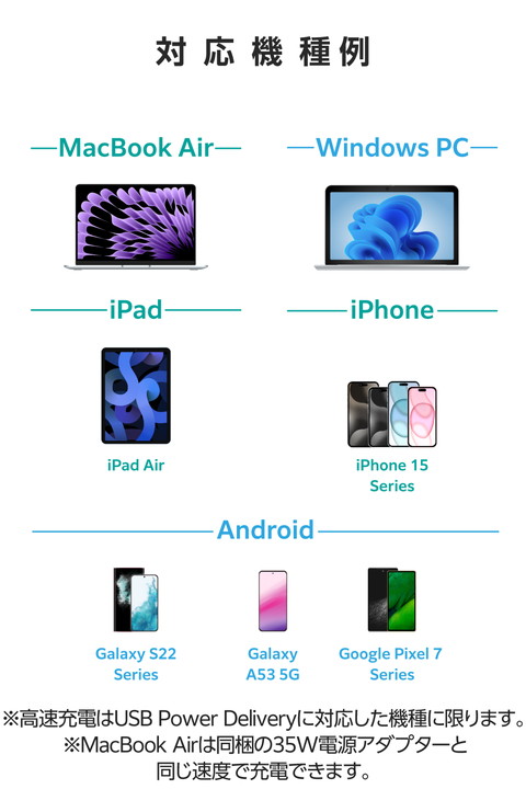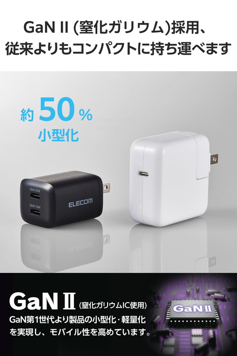 MacBook AirもiPhoneもこれ1つで充電可能!USB Type-C(TM)ポートを2ポート搭載のAC充電器です。MacBook Airに同梱の電源アダプターと比較し50%以上コンパクトに。USB Power Delivery 35Wで充電でき、モバイルノートパソコンなどの高速充電にも便利です。