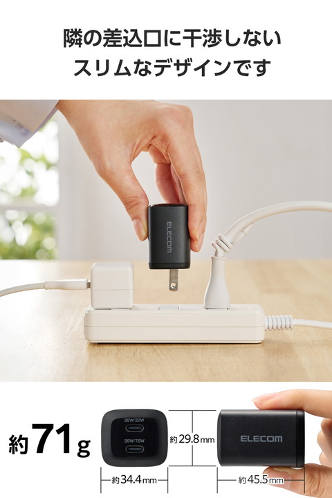 MacBook AirもiPhoneもこれ1つで充電可能!USB Type-C(TM)ポートを2ポート搭載のAC充電器です。MacBook Airに同梱の電源アダプターと比較し50%以上コンパクトに。USB Power Delivery 35Wで充電でき、モバイルノートパソコンなどの高速充電にも便利です。![]() ■USB Type-C(TM)ポートを2ポート搭載し、Macbook Airなど対応するノートパソコン・スマートフォン・タブレットを充電できるAC充電器です。 ■USB Power Delivery 35Wで充電可能。Macbook Airに同梱の35W 電源アダプターと同じ速度で充電できます。 ■iPhoneなどのスマートフォンを2台同時に充電することも可能です。 ■※2ポート同時出力時は合計最大27.5Wとなります。 ■USB Power DeliveryおよびPPS規格に対応。機器に応じて電圧、電流が変化するため、スマートフォンやのタブレットはもちろん、Windowsノートパソコンまで幅広く充電できます。 ■※USB Power Deliveryとは、アダプターと接続機器間で情報をやり取りすることで、その機器間における最適な電力を選択し、高速充電を実現するUSB規格です。PPS(Programmable Power Supply)とは、0.02V単位で電圧を調整し、最適な電力で効率的に供給することができるUSB Power Deliveryのオプション規格です。 ■GaN II (窒化ガリウム)を採用し、高出力ながらコンパクトサイズを実現。Macbook Airに同梱の電源アダプターと比較し、50%以上小型・軽量化。プラグ部分を折り畳むこともできるため、バッグの中でもスペースを取りません。ビジネスでの外出やリモートワーク、出張、旅行など持ち運びにも便利です。 ■Macbook付属のUSB-C - MagSafe 3ケーブル を組み合わせて使うことができ、Magsafe3の使いやすさをそのまま使用できます。 ■耐トラッキング性の要求事項(PSE:電気用品安全法)を満たしたコンセントプラグを採用しています。 ■※充電ケーブルは同梱していません。別途ご用意ください。 ■※USB Type-C・Lightning・Micro-B以外の端子に変換するケーブルや変換アダプターを使用すると、給電(充電)できない場合や、充電が遅くなる場合があります。 ■※USB Type-C and USB-C are trademarks of USB Implementers Forum. ■自社環境認定基準を1つ以上満たし、『THINK ECOLOGY』マークを表示した製品です。 ■廃棄物削減に取り組み、製品に同梱する取扱説明書等をペーパーレス化した製品です。 ■環境保全に取り組み、製品の包装容器におけるプラスチック重量を、社内基準製品より20%以上削減した製品です。 ■環境保全に取り組み、製品の包装容器が紙・ダンボール・ポリ袋のみで構成されている製品です。 ■環境保全に取り組み、製品本体の主たる構成部品や構成要素の原料に占めるリサイクル原料の割合が10%を超えている製品です。 ![]() ■対応機種:各USB Type-C(TM)ポートからUSB Power Delivery 35WおよびPPS(Programmable Power Supply)30Wの規格内で充電が可能なノートパソコン、スマートフォンなどの機器。2ポート同時接続時、合計最大27.5Wまでの出力で充電・給電可能な機器とその組み合わせ。 ■コネクター形状:USB Type-Cポート×2 ■定格入力電圧:AC100〜240V、50/60Hz ■定格入力電流:1.2A ■定格出力電力:単独接続時:USB Type-C1ポート/USB Type-C2ポート最大出力35W、PPS最大出力30W、2ポート同時接続時:合計最大出力27.5W、USB Type-C1ポート最大出力20W、USB Type-C2ポート最大出力7.5W ■定格出力電圧:単独接続時:USB Type-C1ポート/USB Type-C2ポート:5V/9V/15V/20V、PPS出力5〜11V、2ポート同時接続時:USB Type-C1ポート:5V/9V、USB Type-C2ポート:5V ■定格出力電流:単独接続時:USB Type-C1ポート/USB Type-C2ポート:5V/9V時3A、15V時2.3A、20V時1.75A、PPS出力5〜11V時3A、2ポート同時接続時:USB Type-C1ポート:5V時3A、9V時2.22A、USB Type-C2ポート:5V時1.5A ■外形寸法:幅約45.5mm×厚み約34.4mm×高さ約29.8mm ■重量:約71g ■カラー:ブラック ■コンセントプラグ仕様:90度スイング構造 ■使用温度:0℃〜25℃ ■法令:◇PSE 特定電気用品 ■保証期間:1年間 |