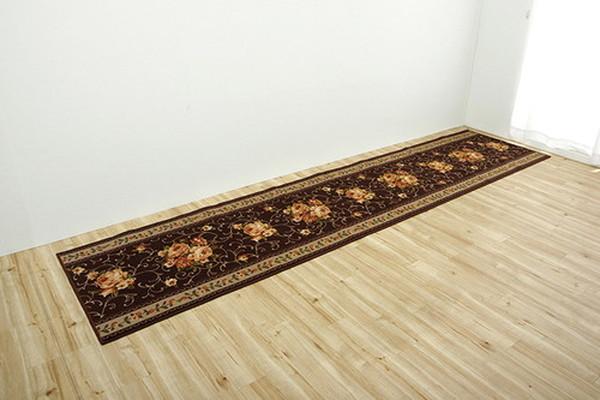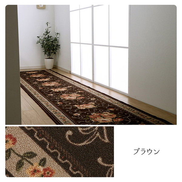 商品仕様: 廊下カーペット/ラグマット 【花柄 エレガンス ブラウン 茶 約60×440cm】 撥水 洗える 速乾性 防傷加工 〔玄関 入口 リビング〕