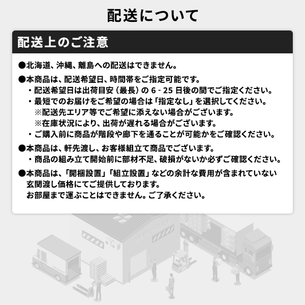 ※時間指定は到着予定を保証するものではございません。交通状況や配送会社の都合によりご依頼通りに配送ができな場合がございます。