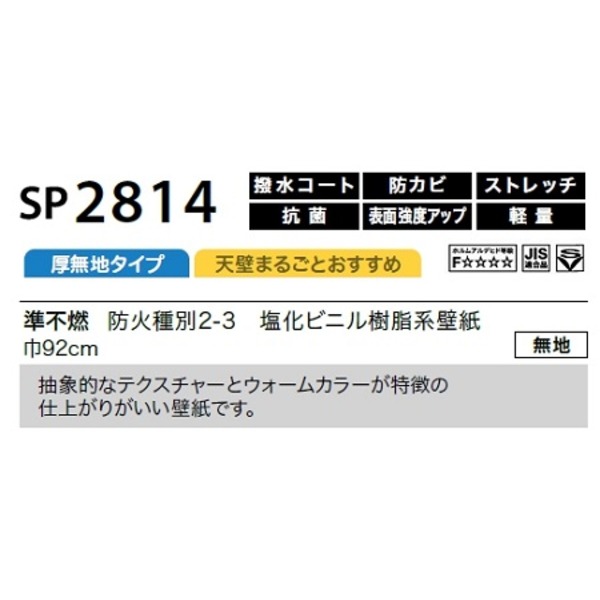 のり無し 壁紙 SP2814 無地 92cm巾 35m巻 日本製 国産 防カビ 清潔 ホルムアルデヒド対策品 JIS規格 糊無し ウォールペーパー 送料無料