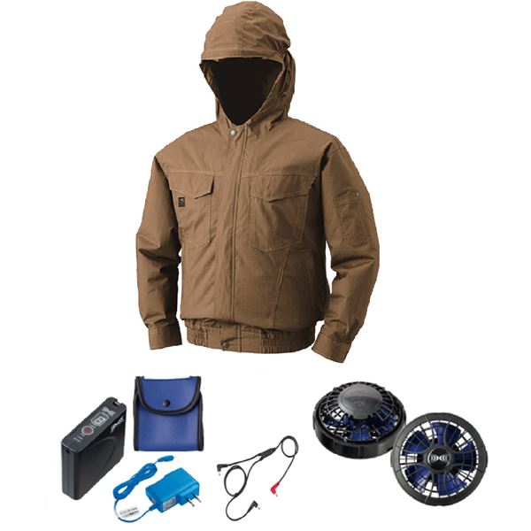 快適な風を纏い、薄手の綿で心地よさを追求 キャメルカラーのフード付き空調服セット FAN2400SPBBとRD9261、LISUPER1がセットになっています サイズはL 快適な風を纏い、薄手の綿で心地よさを追求 キャメルカラーのフード付き空調服セット FAN2400SPBBとRD9261、LISUPER1がセットになっています サイズはL