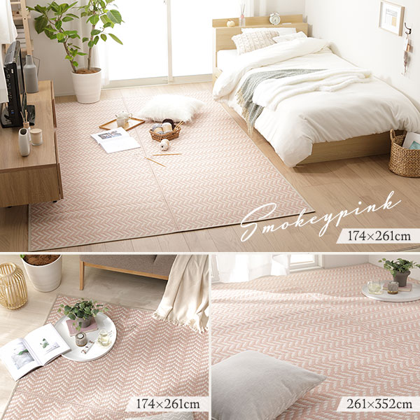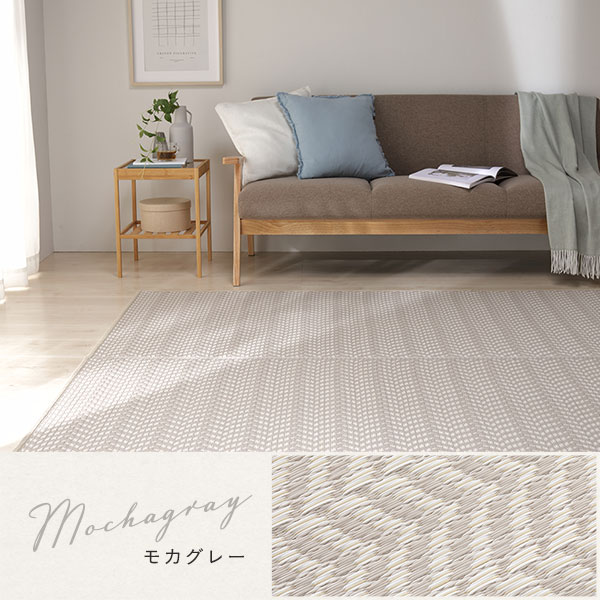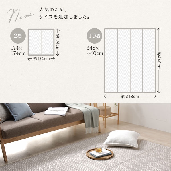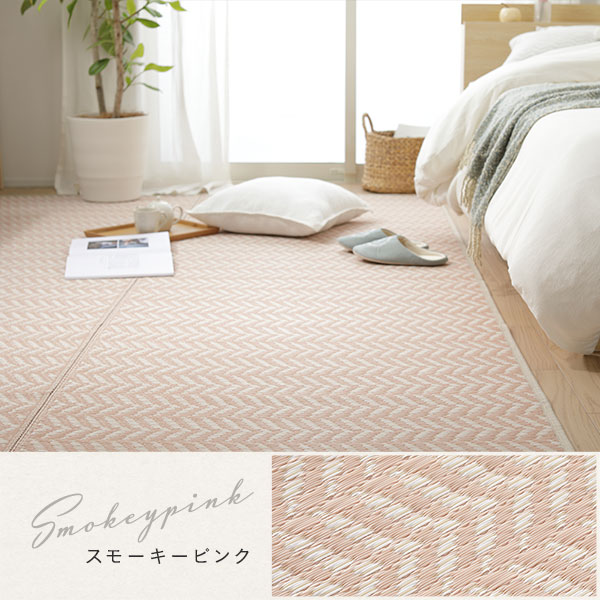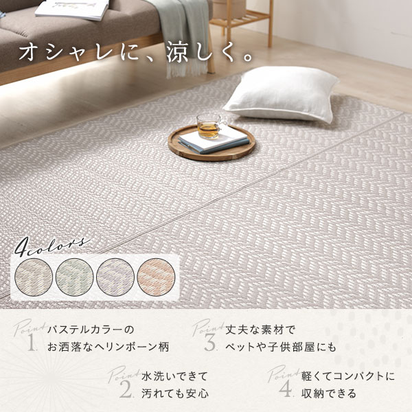 淡い3色のい草風素材をヘリンボーン柄に編み込み、可愛らしいラグに仕上げました。