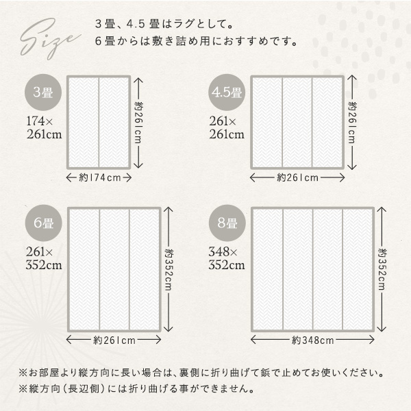 3畳、4.5畳はラグとして。6畳からは敷き詰め用におすすめです。