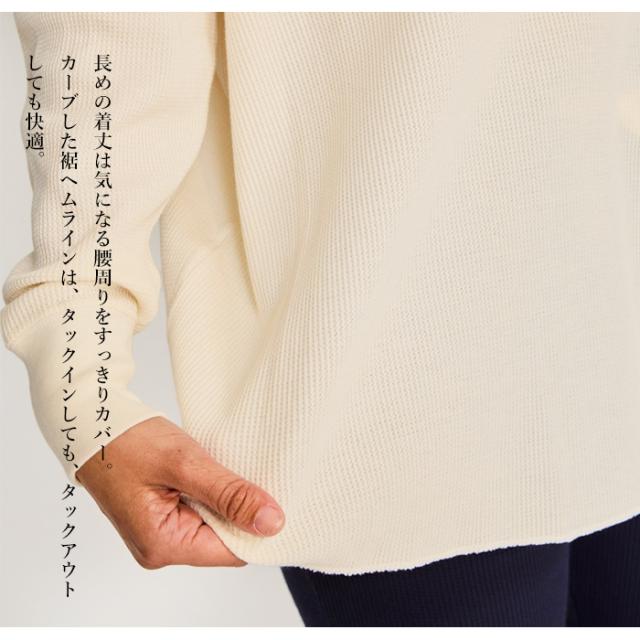 凹凸の表情のあるワッフル素材のヘンリーネック ロングスリーブTシャツです。洗うほどに肌に馴染む柔らかなコットン混素材を使用した、身幅のゆったりとしたシルエット。ドロップショルダーで動きやすく、袖口はリブ仕様。袖は平たい縫製で着心地の良さを高めています。開閉可能なヘンリーネックはクルーネックほどカジュアルではなく、シャツほどきっちりしない程良いニュアンスが魅力。長めの着丈は気になる腰周りをすっきりカバーしてくれます。カーブした裾ヘムラインは、タックインしても、タックアウトしても快適。首元にネームデザインをプリントするTAGLESS(タグレス)仕様で襟ネームの肌当たりを解消し快適な着心地。ちょっとした小物を収納できるリユース可能なエコパッケージ。 |