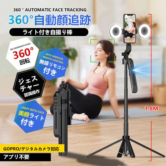 三脚 スマホ用 自撮り棒 リモコン 自動顔追跡 AI搭載 LEDライト セルカ棒 bluetooth 三脚付き スマホスタンド ライブ配信用 360°