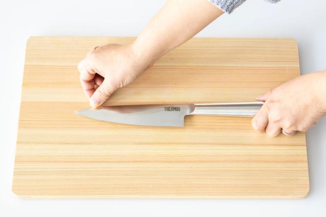 見た目にも美しい一体型のハンドルですが、ほどよい重量感と握りやすさも兼ね備えています。力を入れやすく、トントンと軽い切り心地で食材をカットできます。