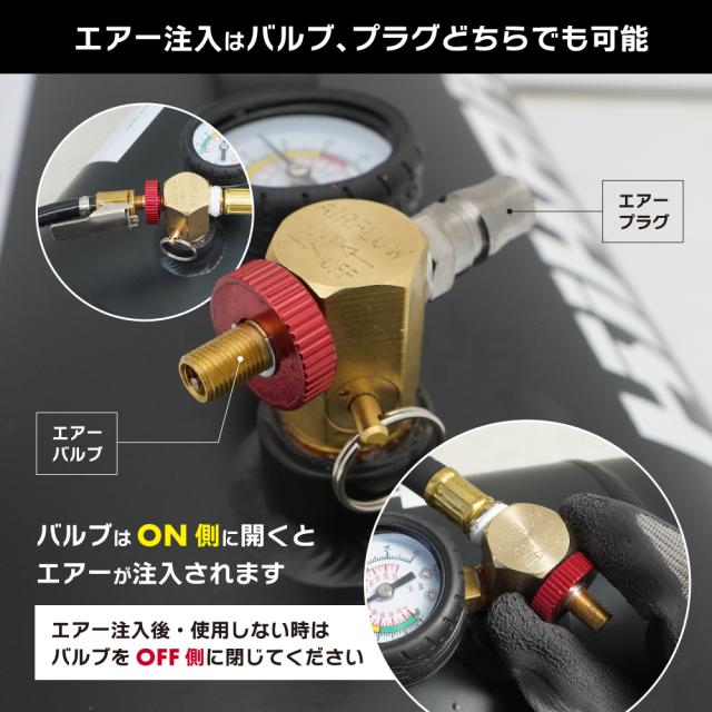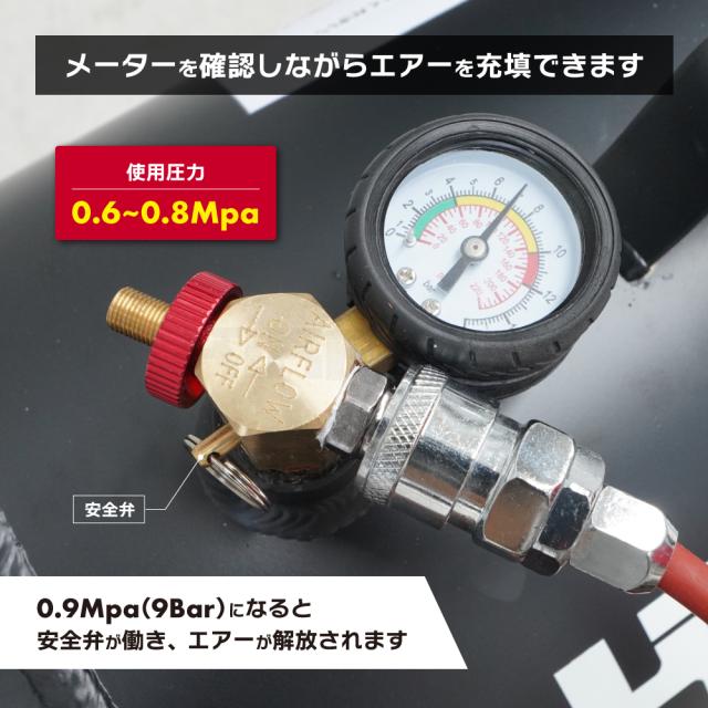 タイヤへの空気補充・コンプレッサーのサブタンクに! ●商品名 KIKAIYA エアータンク 36L ●36Lのアルミ製ポータブルエアータンクです ●アルミボディで軽量、エアーを注入して自由に持ち運べます ●電源やコンプレッサーが届かない場所で活躍でき、タイヤへの充填もラクラク ●エアー注入はエアーバルブ・エアープラグどちらでも可能です ●開閉バルブ式で、バルブをON側に開くとエアーを充填できます ●安全弁がついており、0.9Mpa(9Bar)になるとエアーが解放される安全設計 ●コンプレッサーのサブタンクとして使用すると、効率性と利便性を向上できます ●持ち運び・保管する際はエアー漏れを防ぐ為、バルブを閉めてください ※タイヤチャック・エアープラグは、お客様にてお取り付けください (付属外のシールテープを巻き、14mmスパナでしっかりと差し込んでください) 品番:ATK-10 |