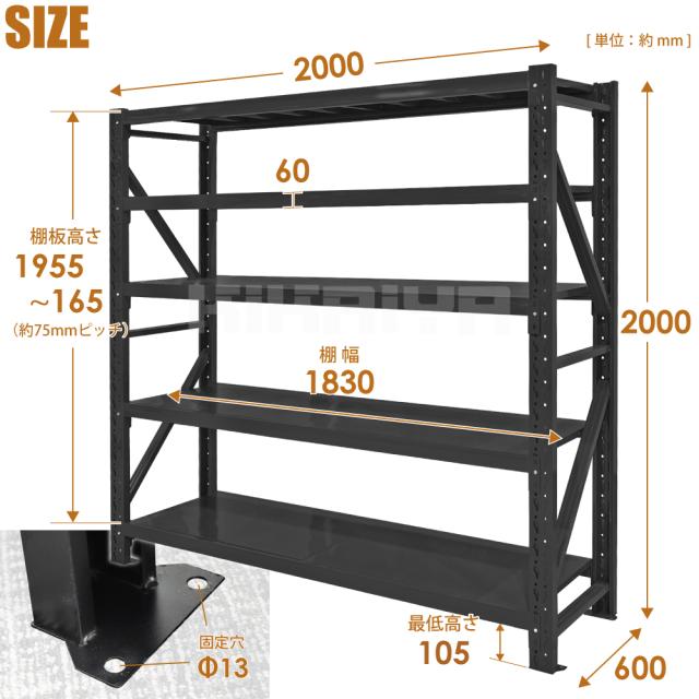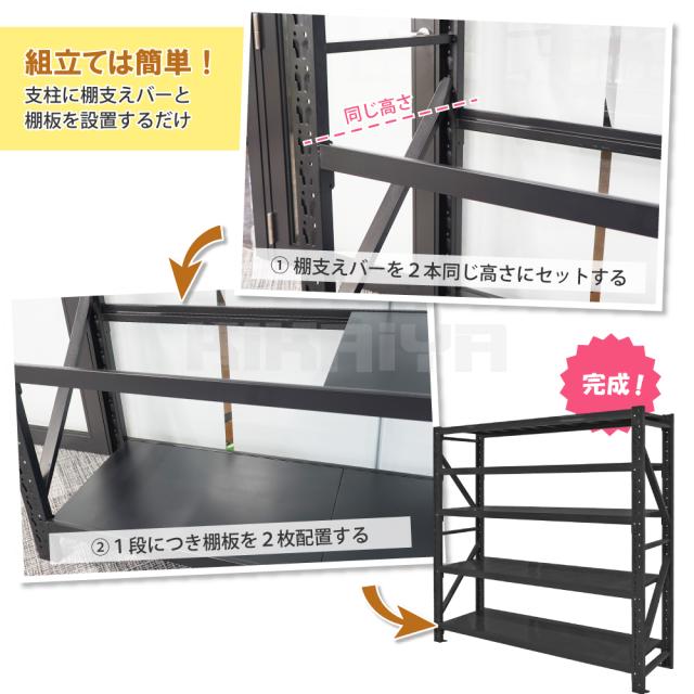 スチールラック 5段 ボルトレス ブラック ワイド幅 業務用 収納棚 中量棚 メタルラック 耐久性あり 350kg 頑丈 高強度 幅200×奥行60×高さ200cm KIKAIYA
