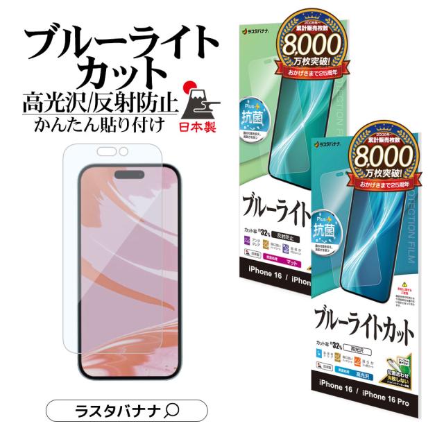 【送料無料】iPhone16 16 Pro iPhone15 フィルム 平面保護 ブルーライトカット 高光沢 透明 アンチグレア 反射防止 抗菌 日本製 簡単貼り付け アイフォン ラスタバナナ E4372IP461 Y4373IP461 E4442IP461P Y4443IP461P
