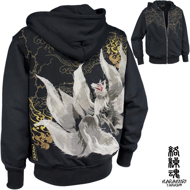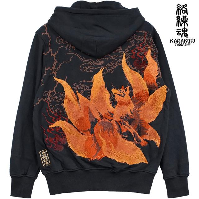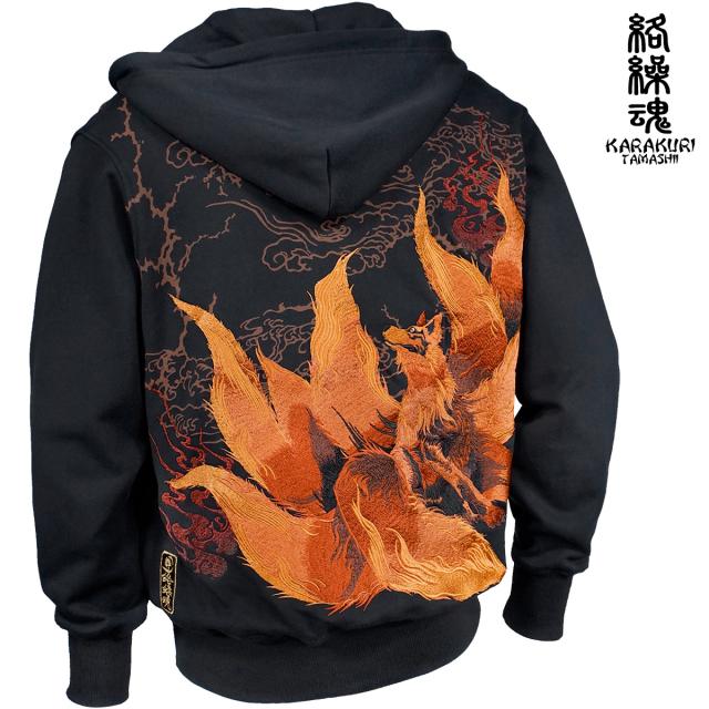 からくり魂 絡繰魂 粋 パーカー 九尾 和柄 メンズ 刺繍 フルジップ ジップパーカー mens(橙狐ブラック黒) 243090