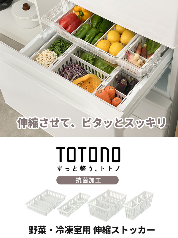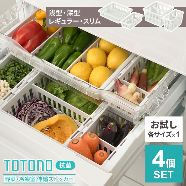 リッチェル 冷蔵庫収納ボックス トトノ(totono) 野菜・冷凍室用 伸縮ストッカー お試し4個セット ( 浅型・深型・レギュラー・スリム 各サイズ×1個ずつ ) ホワイト | 冷蔵庫 ケース トレー 収納 ラック 収納ケース 仕切り 野菜室