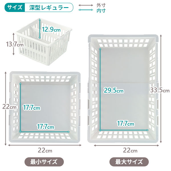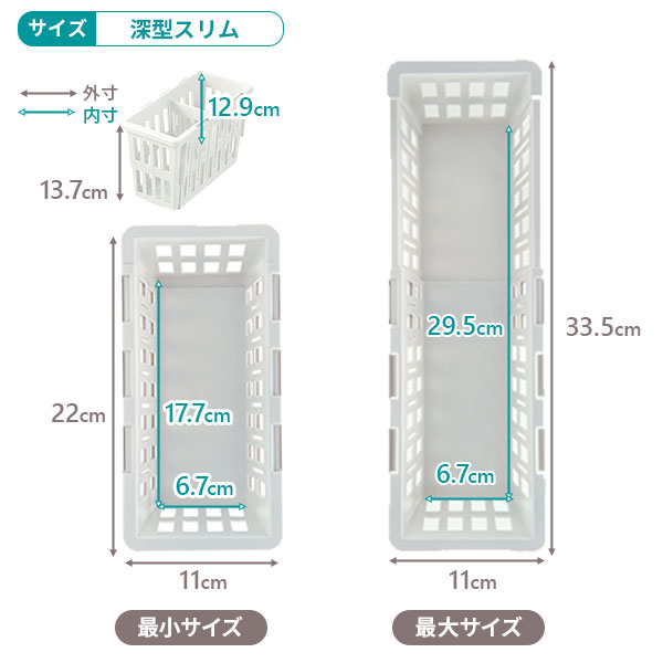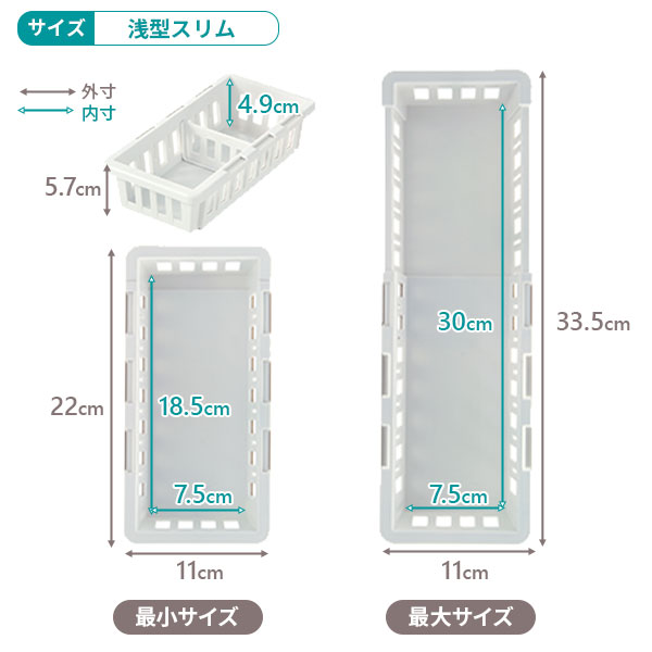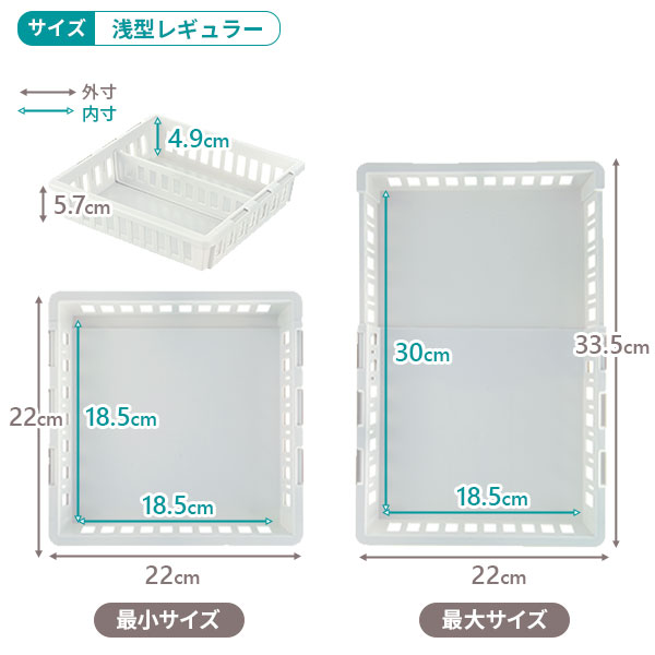 サイズ(約):浅型レギュラー/幅22×奥行22〜33.5×高さ5.7cm 浅型スリム/幅11×奥行22〜33.5×高さ5.7cm 深型レギュラー/幅22×奥行22〜33.5×高さ13.7cm 深型スリム/幅11×奥行22〜33.5×高さ13.7cm