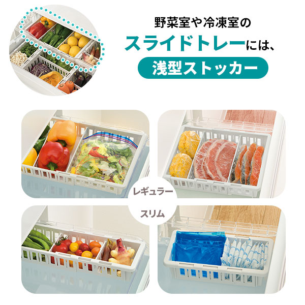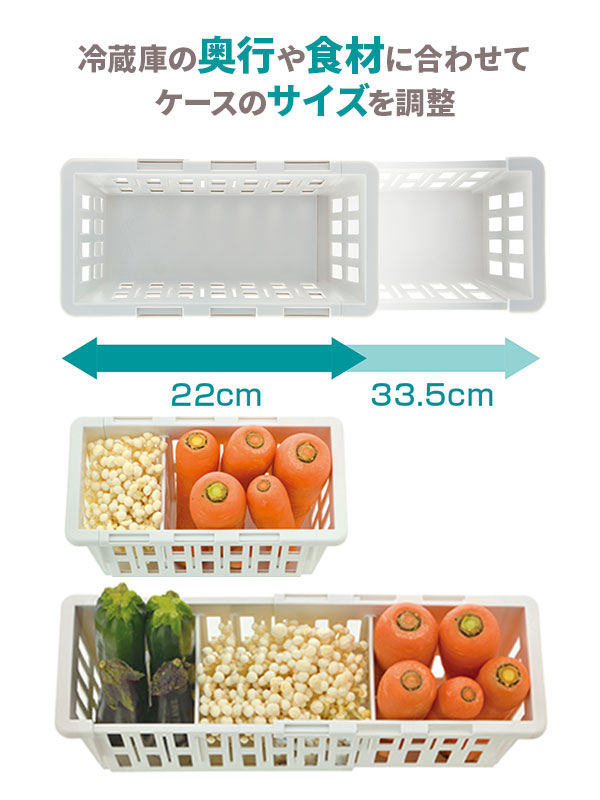 冷蔵室や冷凍室の奥行に合わせて伸縮できる食品収納ケース。