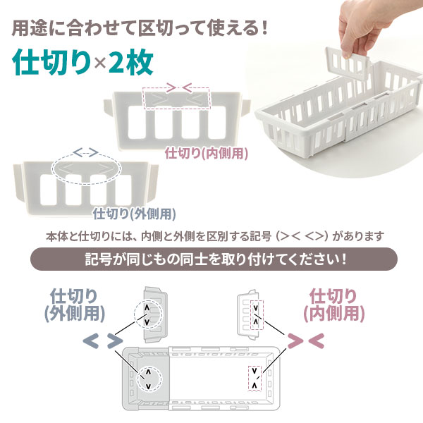 ケース底の「<>」「><」マークと仕切りのマークを合わせてスリットに差し込みます。