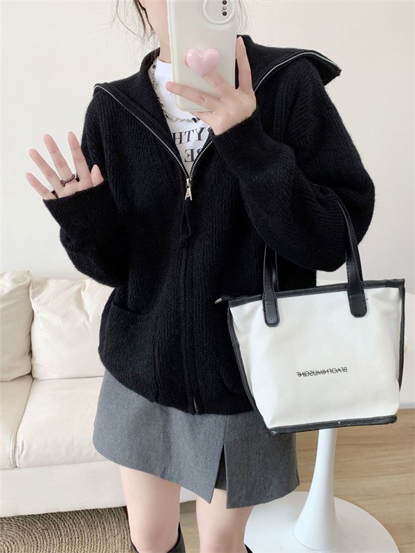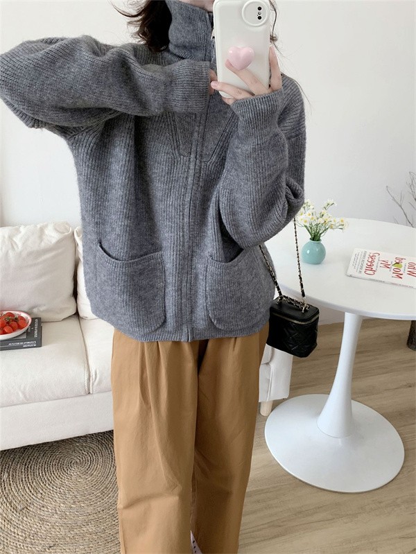 【商品名】新作 襟付きケーブルニット レディース 前開き ファスナー付き 無地ニットカーディガン 秋冬 柔らかくゆったり セーターアウター おしゃれ フリーサイズ かわいい