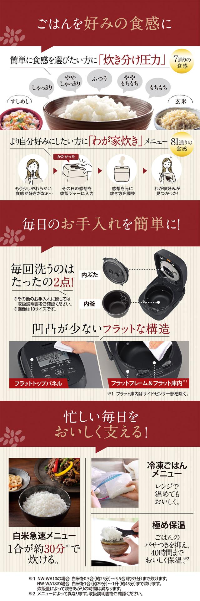 * 白米(炊き分け5通り)・わが家炊き(81通り)・エコ炊飯・鉄器おこげ・熟成炊き(白米/玄米)・白米急速・炊きこみ