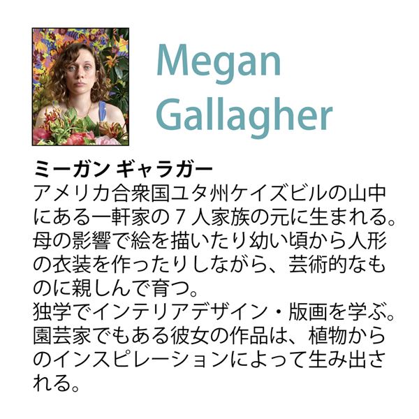 MEGAN GALLAGHER/アメリカ合衆国ユタ州ケイズビルの山中にある一軒家の7人家族の元に生まれる。母の影響で絵を描いたり幼い頃から人形の衣装を作ったりしながら、芸術的なものに親しんで育つ。独学でインテリアデザイン・版画を学ぶ。園芸家でもある彼女の作品は、植物からのインスピレーションによって生み出される。