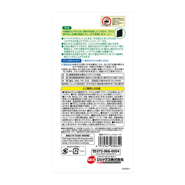 ・内側部分は水に浮くので、誤って磁石が外れてしまっても水槽の底に落下せず、簡単に再セットすることができます。