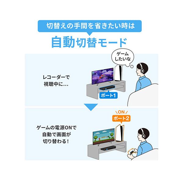 ●HDMI機器起動時に自動でポートを切り替えてくれる「自動切替モード」とボタン切替のみで切替操作し誤作動を防ぐ完全手動切替モードを選べる2WAY方式。