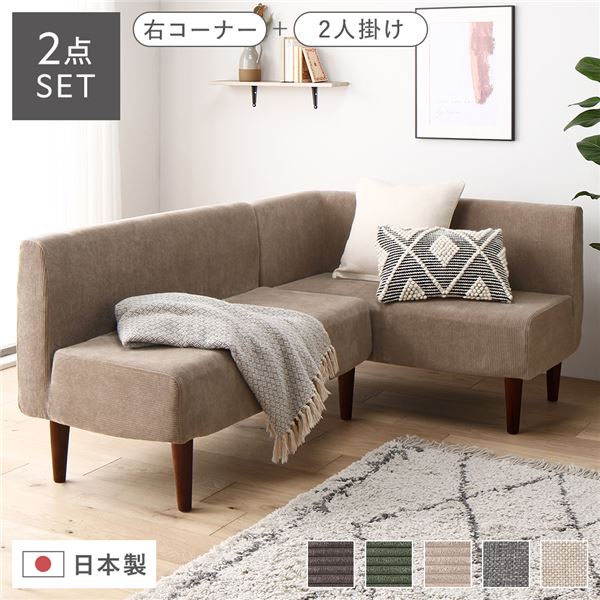 応接セット 日本製 国産 ダイニングソファ 2点セット 右コーナー+2人掛け コーデュロイベージュ ブラウン脚 ポケットコイル ソファセット 茶 送料無料