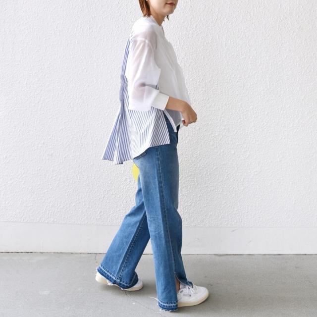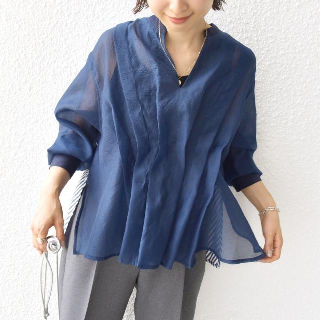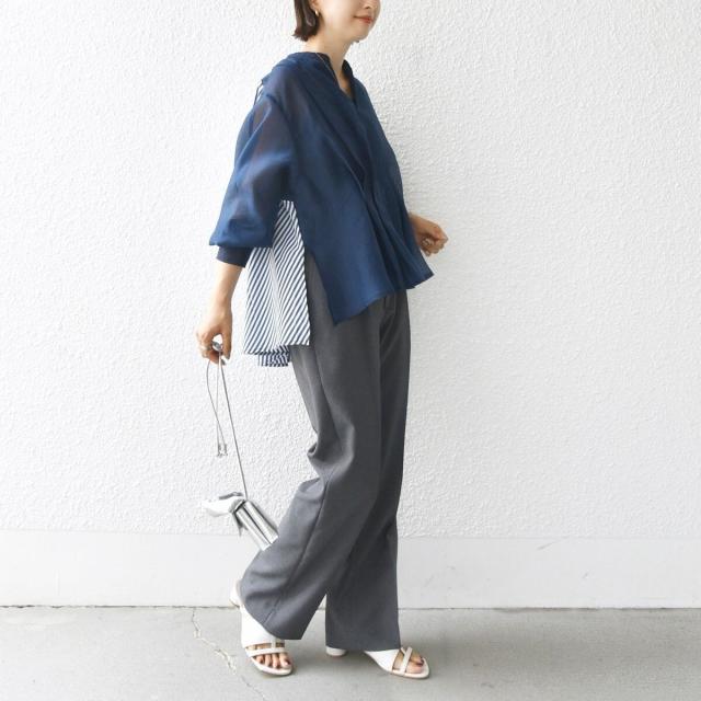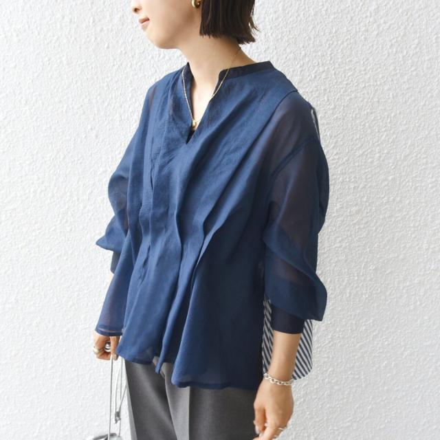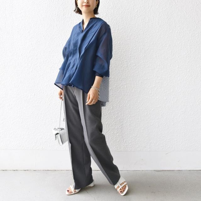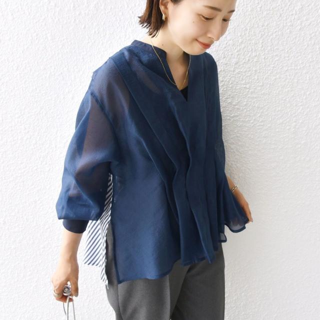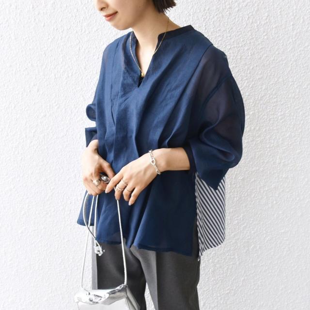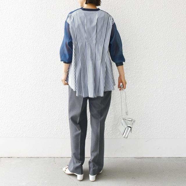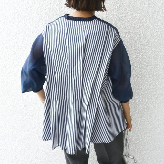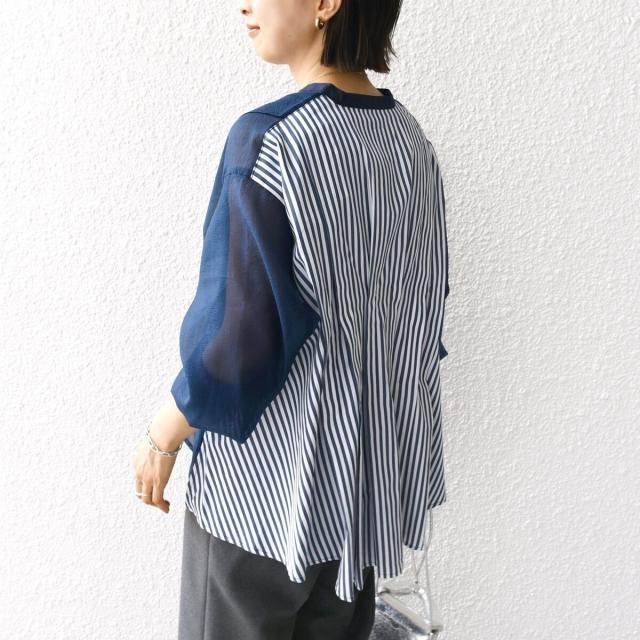 シアーとストライプの異素材コンビが主役になるブラウス。