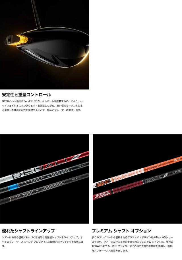 あらゆる打点で驚異的な飛距離を実現するタイトリスト GT2 ドライバーは、ミスヒットに対するさらなる許容性を発揮して最大のスピードパフォーマンスを引き出します。卓越したボールスピードと高慣性モーメント設計による一貫性がドライバーショットに大きな自信と安心感を与えます。●より強化された飛距離性能と安定性のバランス