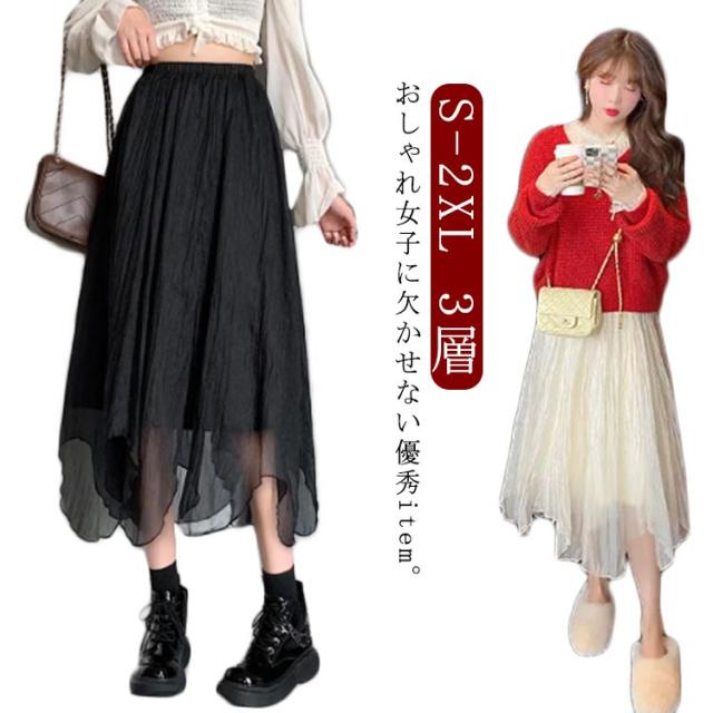 チュールスカート アシメトリー ロング チュールスカート ミモレ丈 ロングスカート チュール キレイめ 3層 裏起毛 ブラック ベージュ ふんわり