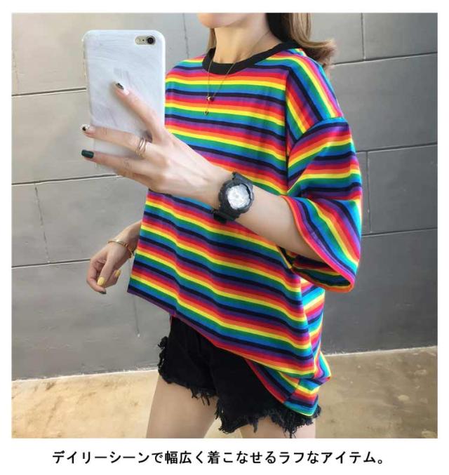 Tシャツ トップス 半袖カットソー カジュアル ロング ゆるTシャツ ボーダー ラウンドネック カラフル レディース カラフルボーダー ゆったり レインボー