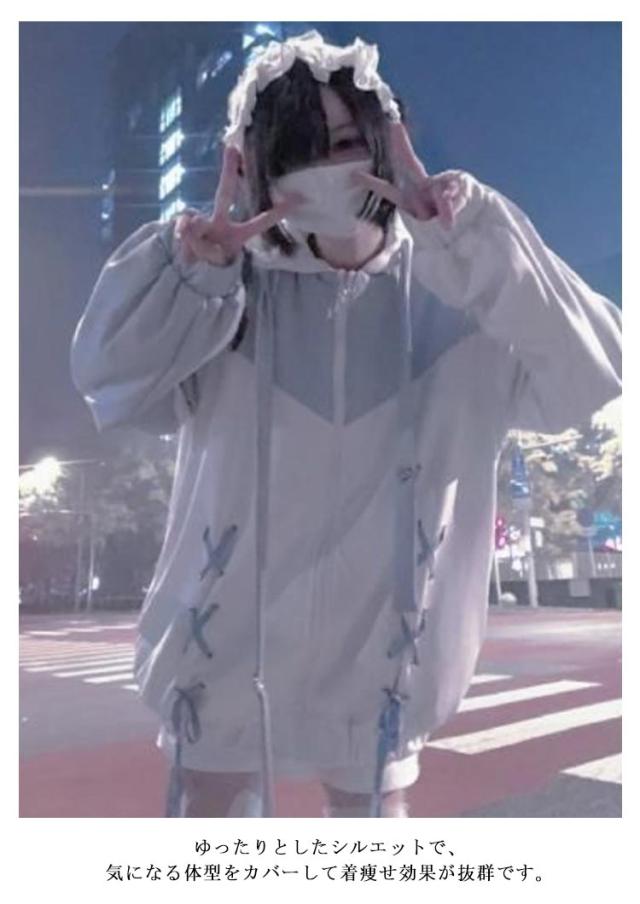水色系 病みかわいい レディース 原宿系 パーカー スウェット トップス 長袖 悪魔の角 天使界隈 水色系 フード付き トップス ハートバックル レースアップ リボン 地雷系 ジップアップ 渋谷系 サブカル系 ファッション 服 学生 春 秋