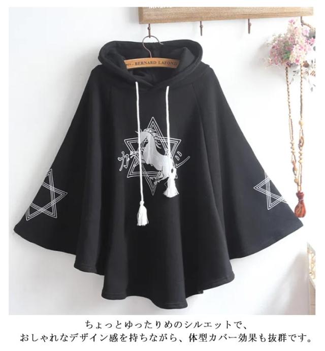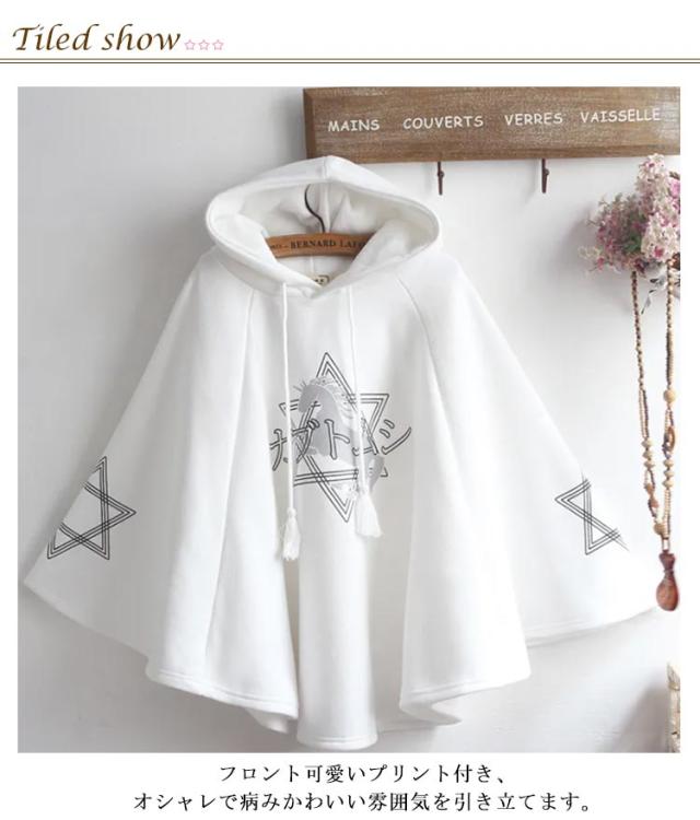 | カジュアルな原宿スタイル。フード付きなので、保温性がGood! フロント可愛いプリント付き、オシャレで病みかわいい雰囲気を引き立てます。 ちょっとゆったりめのシルエットで、おしゃれなデザイン感を持ちながら、体型カバー効果も抜群です。 ショートパンツやミニスカート、レギンスパンツやロングスカートなど、どんなボトムスともすぐに合わせていただけます。 | |