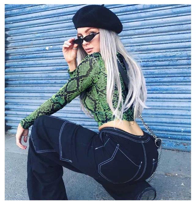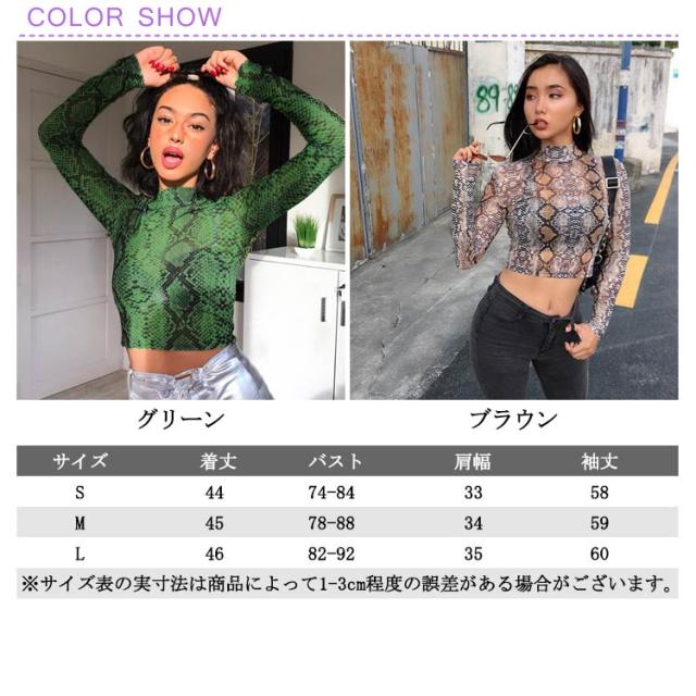 レディース ダンス衣装 韓国 ダンス ストリート系 韓国ファッション ダンス 衣装トップス ダンス衣装 ヒップホップ 長袖 ファッション ロンt セクシー 派手 へそ出し パイソン柄 衣装 かっこいい シースルー ハイネック 秋冬 グリーン ブラウン S M