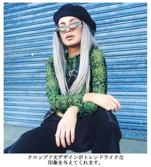 | S-L!パイソン柄がインパクト大で目を引く長袖シアートップス。 セクシーなボディラインが特徴の目の細かなメッシュ生地が透け感を演出。 クロップド丈デザインがトレンドライクな印象を与えてくれます。 | |