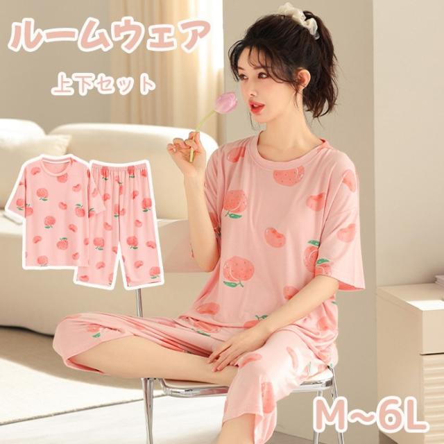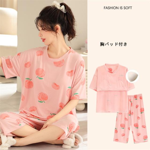 パジャマ レディース 桃柄 半袖 上下セット 胸パッド付き ピンク 部屋着 寝間着 ルームウェア ぽっちゃり 春 夏 可愛い かわいい 薄手