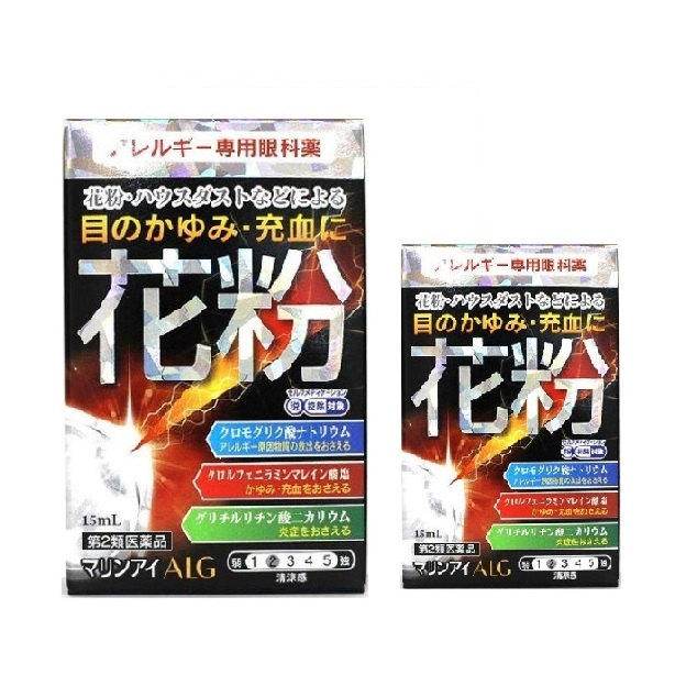医薬品区分一般配置兼用医薬品薬効分類アレルギー用点眼薬製品名マリンアイALG製品の特徴○抗アレルギー剤として使用されているクロモグリク酸ナトリウム配合点眼剤にさらに生薬由来成分であるグリチルリチン酸二カリウムを配合したアレルギー症状に効く点眼薬です。○クロモグリク酸ナトリウムは,アレルギーを引き起こす化学物質の放出を抑えることにより花粉やハウスダストなどによる目のアレルギー症状を緩和します。 さらに,抗炎症剤のグリチルリチン酸二カリウムと抗ヒスタミン剤のクロルフェニラミンマレイン酸塩の配合により,目のかゆみや充血,なみだ目などのつらいアレルギー症状にすぐれた効果を発揮します。○アレルギー症状を起こした目にさわやかな清涼感を与えます。使用上の注意■してはいけないこと(守らないと事故が起こりやすくなります。)●点鼻薬と併用する場合には,使用後,乗物又は機械類の運転操作をしないでください (眠気があらわれることがあります)。■相談すること1.次の人は使用前に医師,薬剤師又は登録販売者に相談してください。 (1)医師の治療を受けている人。 (2)減感作療法等,アレルギーの治療を受けている人。 (3)妊婦又は妊娠していると思われる人。 (4)薬などによりアレルギー症状を起こしたことがある人。 (5)次の症状のある人:はげしい目の痛み。 (6)次の診断を受けた人:緑内障。 (7)アレルギーによる症状か他の原因による症状かはっきりしない人。 特に次のような場合は,アレルギーによるものとは断定できないため,使用前に医師に相談してください。 ○片方の目だけに症状がある場合 ○目の症状のみで,鼻には症状がみられない場合 ○視力にも影響がある場合2.使用後,次の症状があらわれた場合は副作用の可能性があるので,直ちに使用を中止し,この添付文書を持って医師,薬剤師又は登録販売者に相談してください。[関係部位:症状]皮膚:発疹・発赤,かゆみ目:充血,かゆみ,はれ,痛み まれに次の重篤な症状が起こることがあります。その場合は直ちに医師の診療を受けてください。[症状の名称:症状]ショック(アナフィラキシー):使用後すぐに,皮膚のかゆみ,じんましん,声のかすれ,くしゃみ,のどのかゆみ,息苦しさ等があらわれる。3.次の場合は,使用を中止し,この添付文書を持って医師,薬剤師又は登録販売者に相談してください。 (1)目のかすみが改善されない場合 (2)2日間使用しても症状がよくならない場合4.症状の改善がみられても,2週間を超えて使用する場合は,医師,薬剤師又は登録販売者に相談してください。効能・効果花粉,ハウスダスト(室内塵)などによる次のような目のアレルギー症状の緩和:目のかゆみ,目の充血,目のかすみ(目やにの多いときなど),なみだ目,異物感(コロコロする感じ)効能関連注意用法・用量1回1〜2滴,1日4〜6回点眼してください。2日間使用しても症状の改善がみられない場合には,医師又は薬剤師に相談してください。用法関連注意(1)小児に使用させる場合には,保護者の指導監督のもとに使用させてください。(2)容器の先をまぶた,まつ毛などに触れさせないでください(目やにや雑菌などのため,薬液が汚染又は混濁することがあります)。また,混濁したものは使用しないでください。(3)コンタクトレンズの装着液として,またコンタクトレンズを装着したまま使用しないでください。(4)点眼用にのみ使用してください。保管及び取扱い上の注意(1)直射日光をさけ,なるべく涼しいところに密栓して保管してください。特に車のダッシュボード等,高温下に放置すると,容器の変形や薬液の変化を生じるおそれがあります。(2)小児の手の届かない所に保管してください。(3)他の容器に入れ替えないでください(誤用の原因になったり,品質が変わることがあります)。(4)汚染をさけるため,他の人と共用しないでください。(5)使用期限(外箱に記載)を過ぎた商品は使用しないでください。また,使用期限内であっても,開封後はできるだけ速やかに使用してください。開封後,長く放置すると濁りや変質のおそれがありますので,注意してください。(6)保存状態によっては,成分の結晶が容器の点眼口周囲やキャップの内側につくことがあります。その場合には清潔なガーゼで軽くふきとってから使用してください。剤形液剤リスク区分等第2類医薬品商品情報成分 100mL中成分分量クロモグリク酸ナトリウム1000mgクロルフェニラミンマレイン酸塩15mgグリチルリチン酸二カリウム125mg添加物エデト酸ナトリウム水和物,イプシロン-アミノカプロン酸,ホウ酸,ホウ砂,d-ボルネオール,d-カンフル,メチルパラベン,プロピルパラベン,エタノールお問い合わせ 消費者相談窓口会社名:佐賀製薬株式会社お客様相談窓口電話:0942-92-5656受付時間:午前9:00〜午後5:00(土,日,祝日を除く)製造販売会社佐賀製薬(株)会社名:佐賀製薬株式会社住所:〒841-0201 佐賀県三養基郡基山町小倉481商品仕様シリーズ名 マリンアイALGブランド名 佐賀製薬原産国/製造国 日本効能・悩み・目的 アレルギーによる目のかゆ