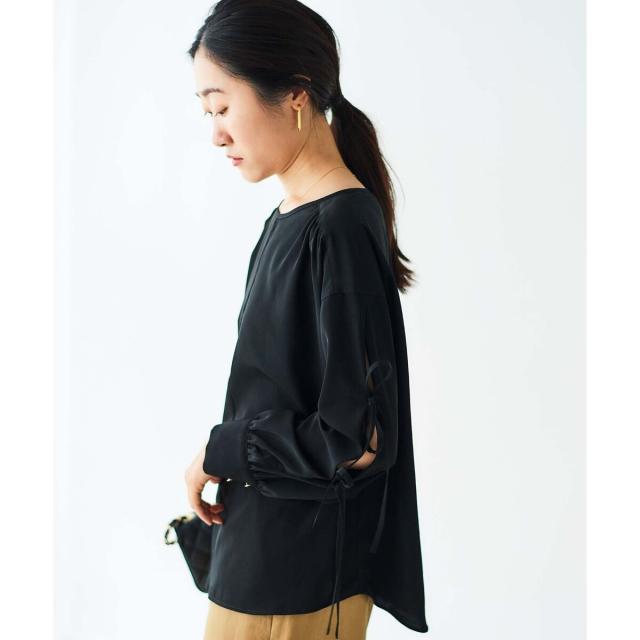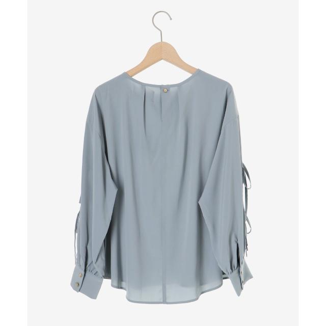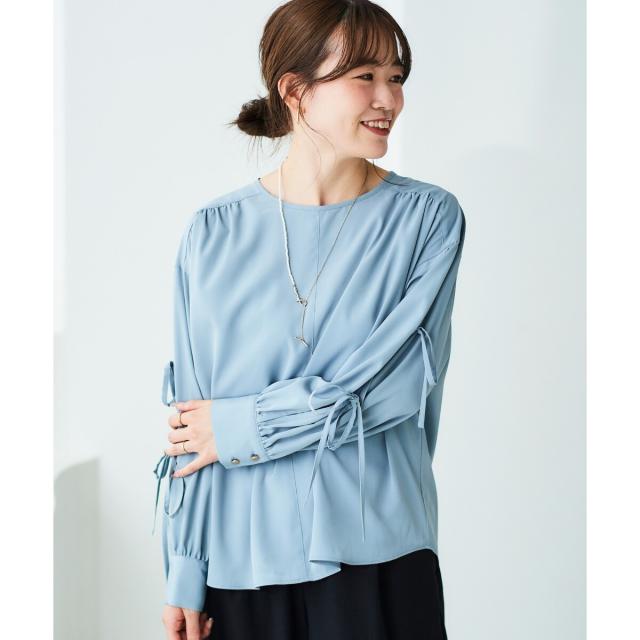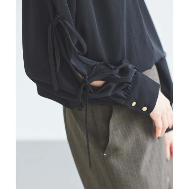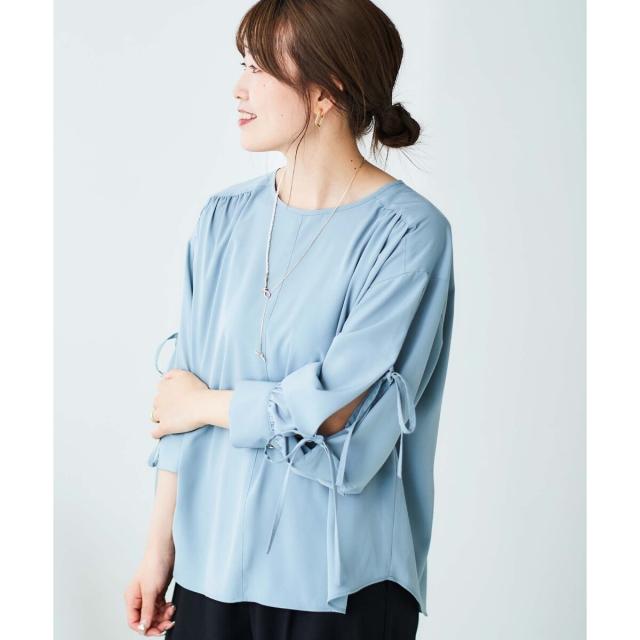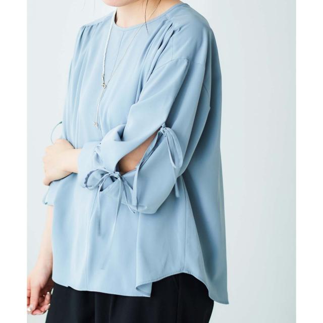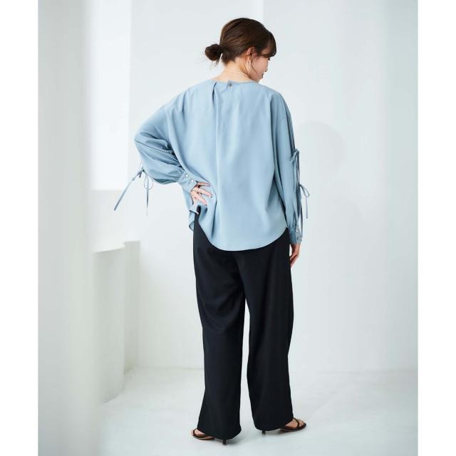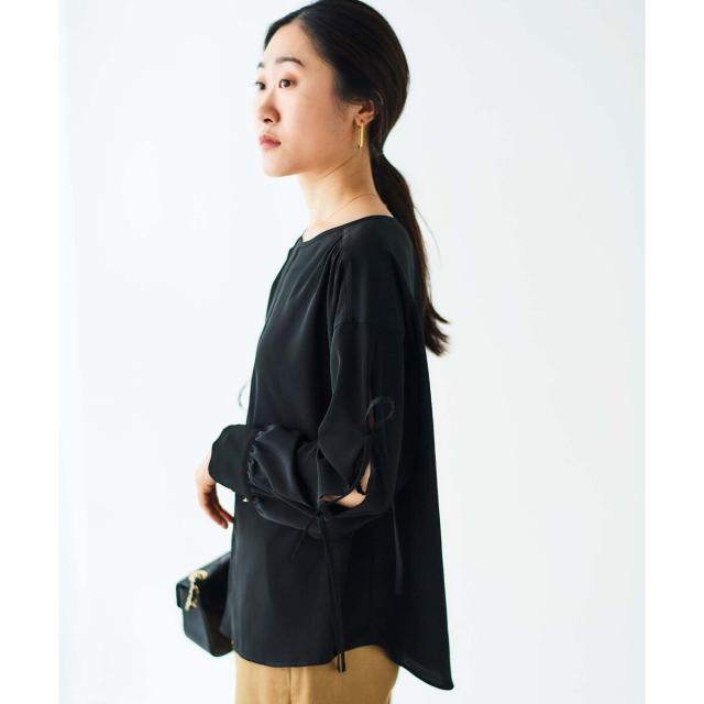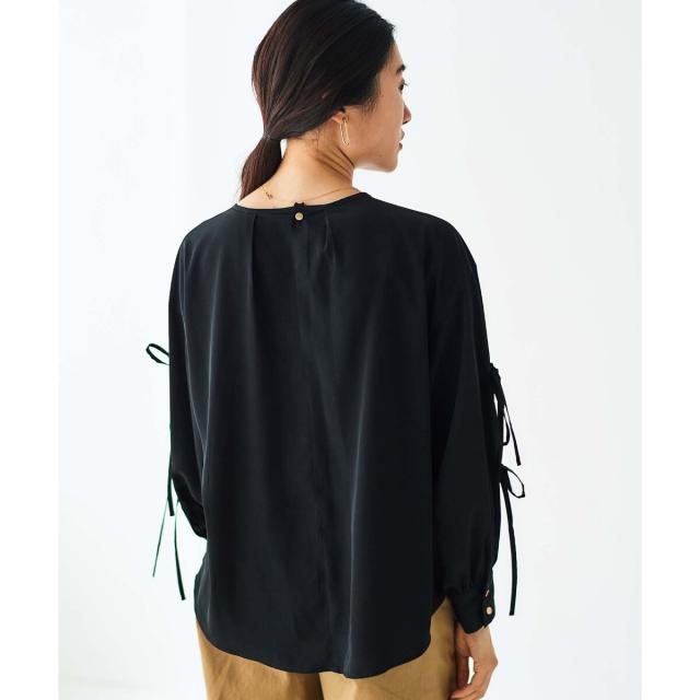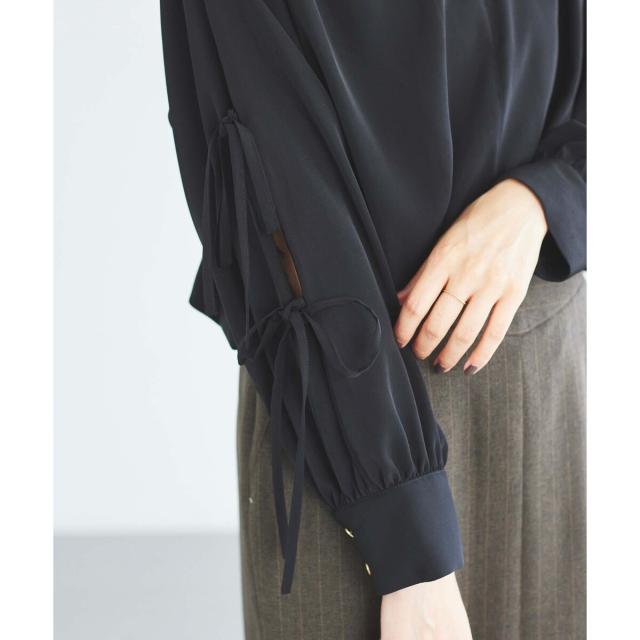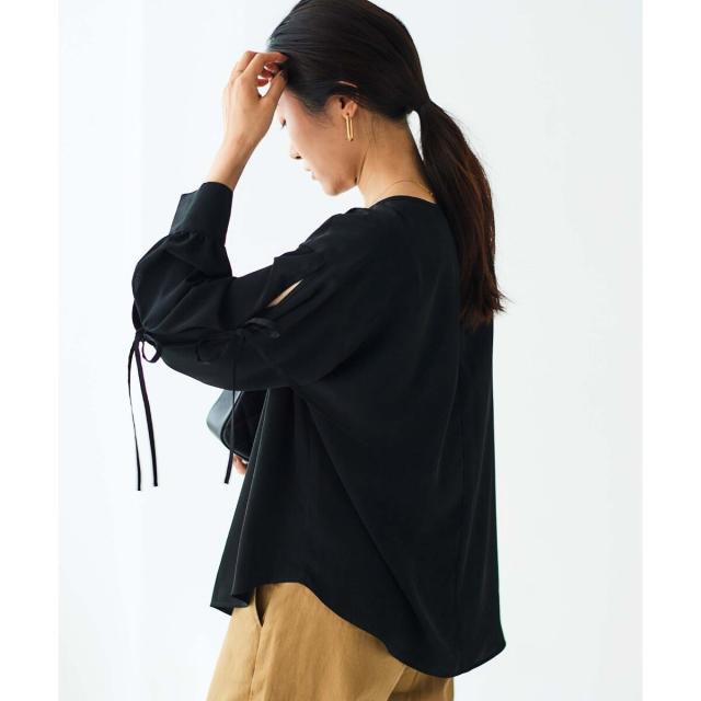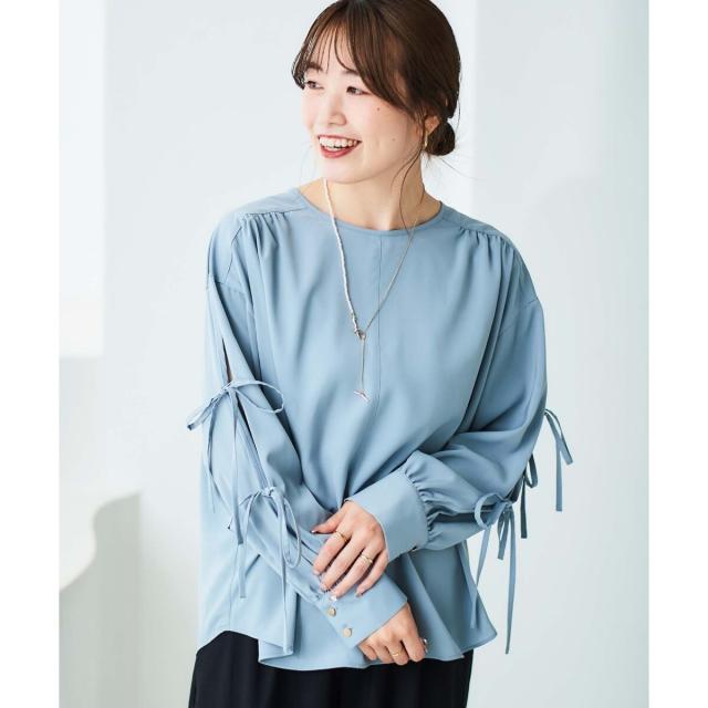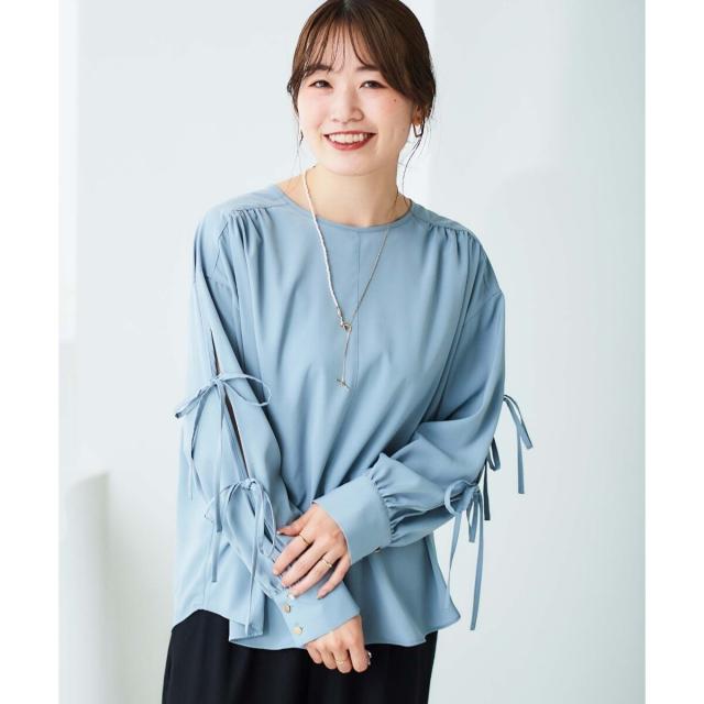 袖のスリットにあしらったリボンがポイントのブラウスです。