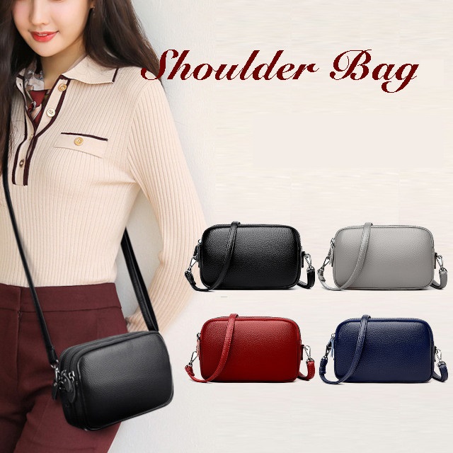 レディース ショルダーバッグ レザー 4色 ブラック ブルー グレー ワインレッド 3ポケット 牛革 斜め掛け シンプルデザイン ショルダー紐取り外し可能