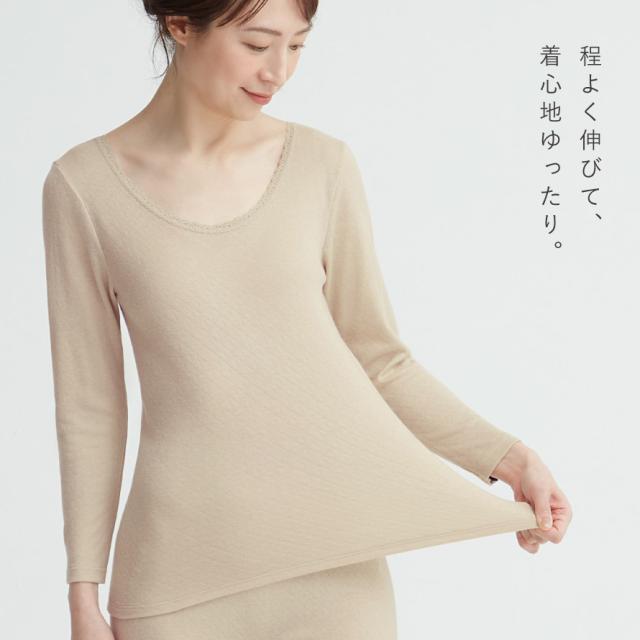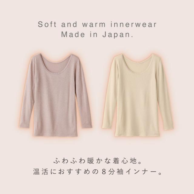 インナー レディース シャツ 肌着 長袖 衿ぐり 広め 8分袖 発熱 インナー あったか 暖かい ベージュ ぬくもりやわらか発熱インナー