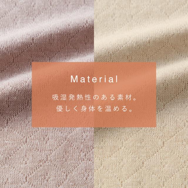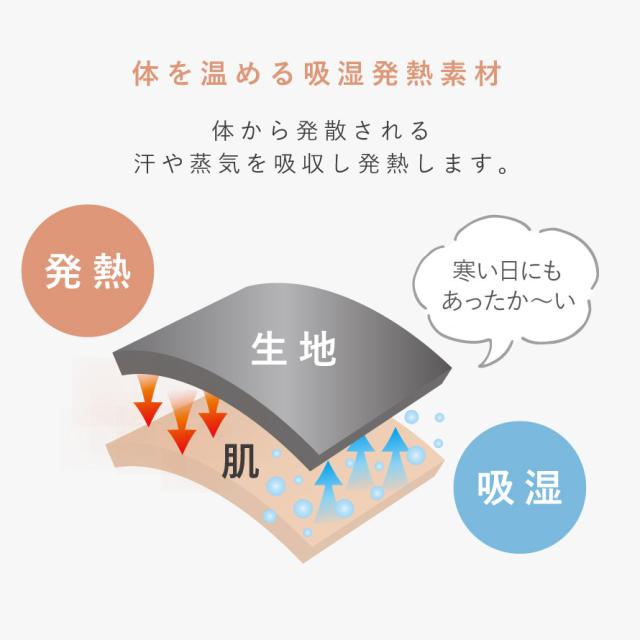 吸湿発熱性のある素材を使用した、肌触り柔らかいインナー。体から発散される、汗や蒸気を吸収し発熱する吸湿発熱生地。優しく体を温めてくれます。