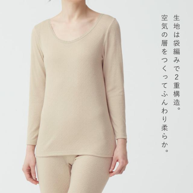 生地は袋編みで2重構造。空気の層をつくり出し、ふんわりとやわらかな肌ざわり。