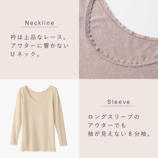 アウターから見えにくい、Uネックの襟ぐりと8分袖。洋服を着ても衿元もすっきり。