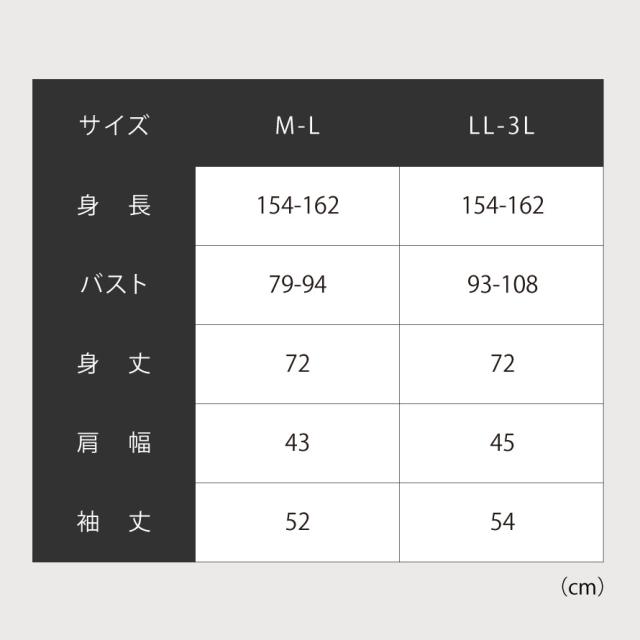 ■サイズ:身長154-162、M-L/バスト79-94、身丈72、肩幅43、袖丈52、LL-3L/バスト93-108、身丈72、肩幅45、袖丈54cm