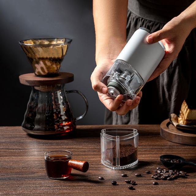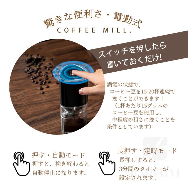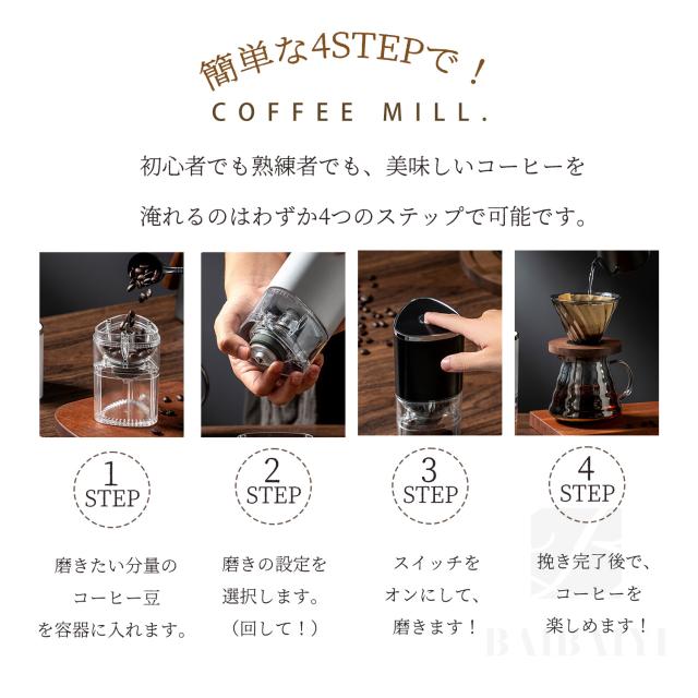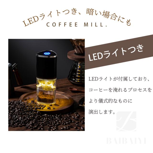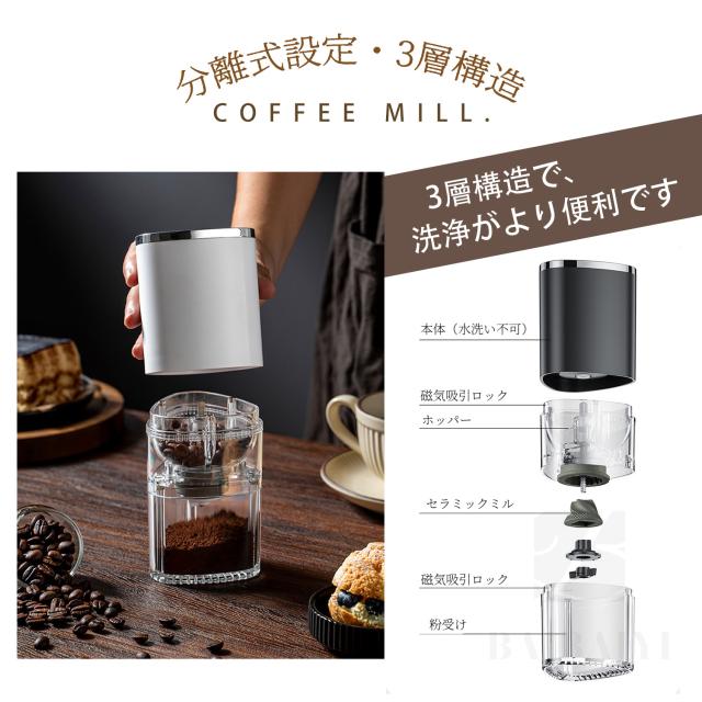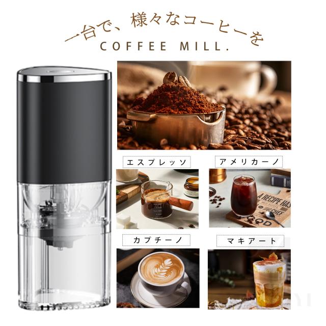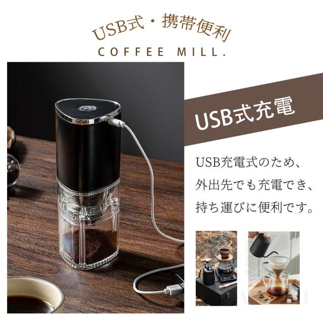 コーヒーミル 電動 無段階 臼式 コニカル式 セラミック刃 コードレス 洗える 水洗い アウトドア 充電式 コンパクト 自動 おしゃれ 珈琲 コーヒー豆磨き グラインダー ミル 粗挽き 細挽き 粒度調整 自動停止 プレゼント特典放送