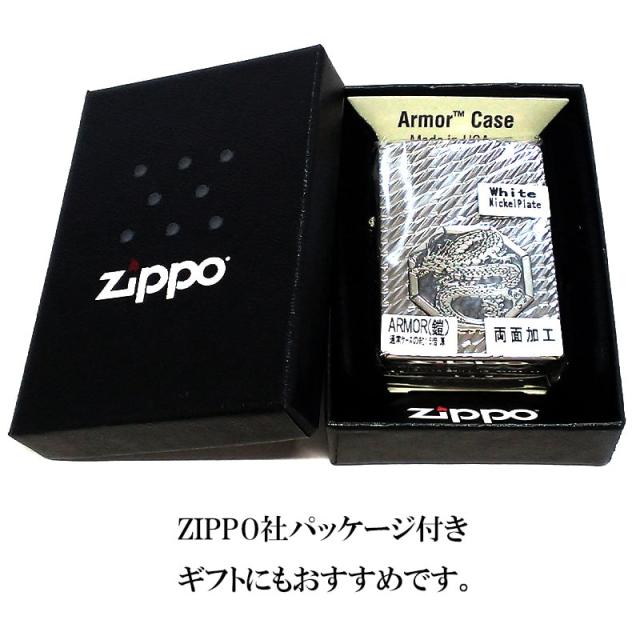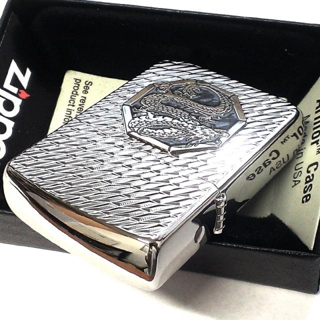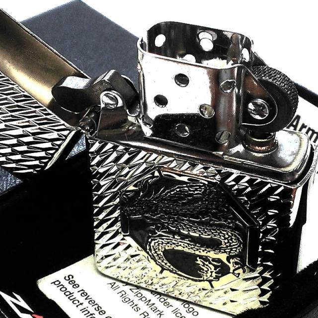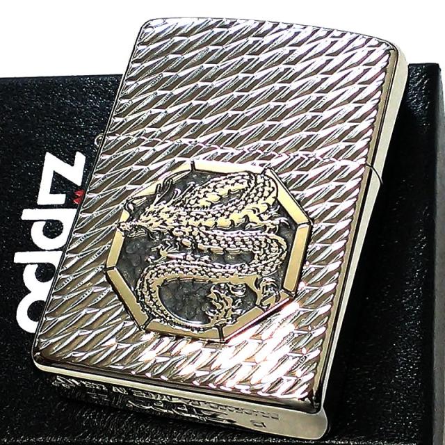 ZIPPO アーマー ジッポ ライター ドラゴン オクタゴンメタル ダイヤカット彫刻 ホワイトニッケル 両面加工 シルバー 龍 重厚 高級 かっこいい おしゃれ メンズ ギフト プレゼント